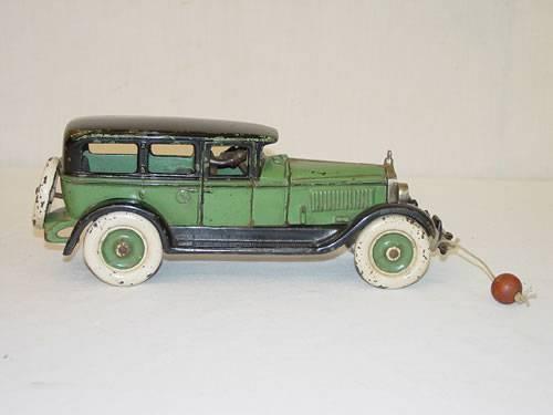 11 1/2" HUBLEY STRAIGHT 8 PACKARD SEDAN W/ DRIVER - GREAT PAINT & ORIGINAL PULL STRING, MINOR WEAR & PAINT LOSS;