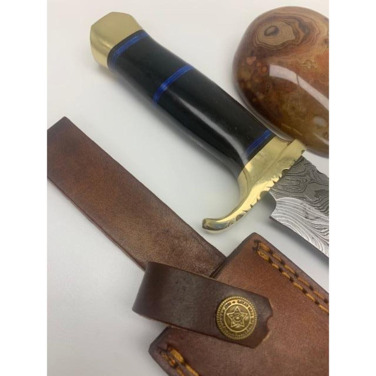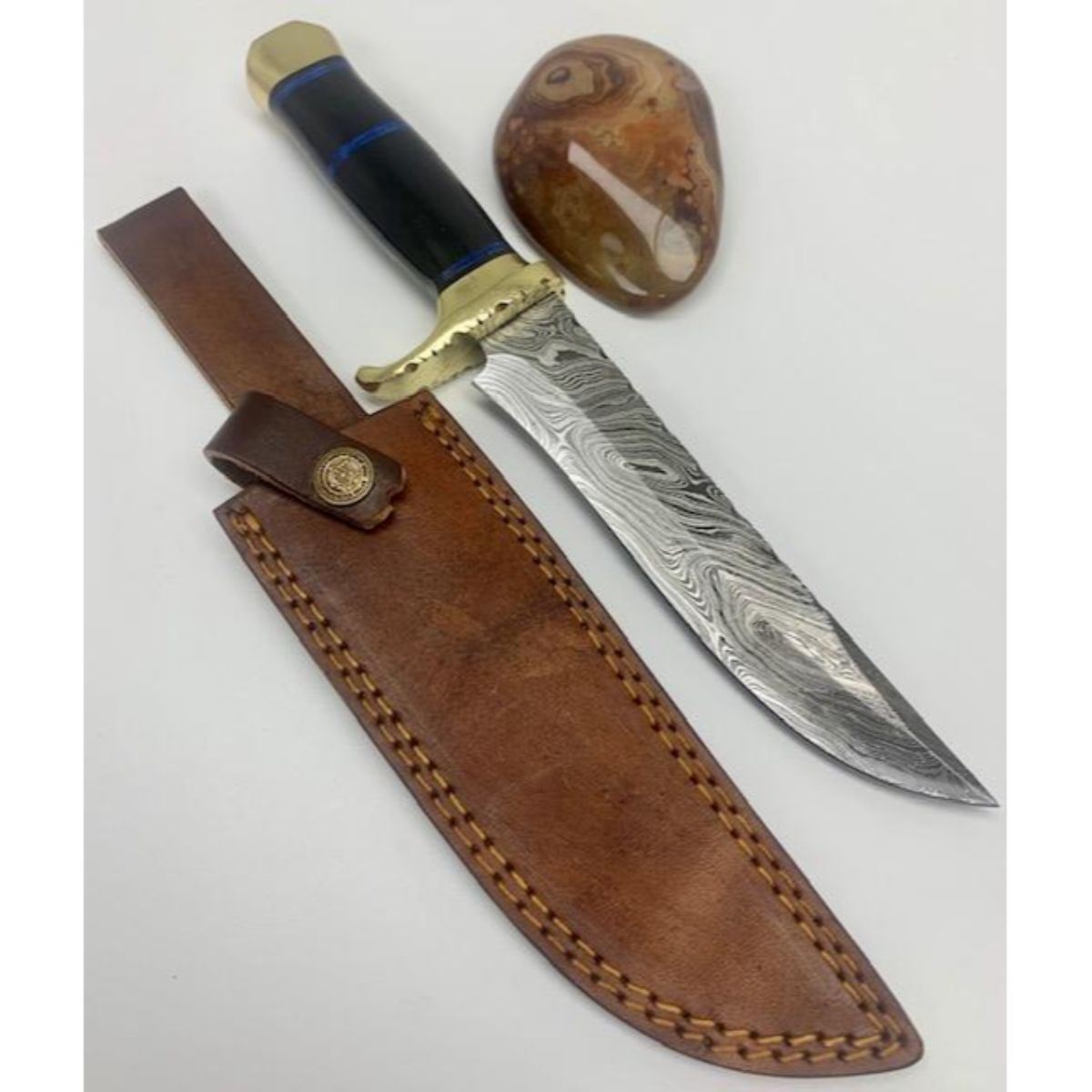 11 1/2" Inlaid Wood & Brass Handle Damascus Hunting Knife With Stitched Leather Sheath. An Excellent Hand Crafted Shive To Add To Any Collection. High Quality steel is utilized to forge the finest product in the world. Unique Custom Hand-Forged Damascus Steel Shive Bladed Construction: Camel Bone, Colored Wood and Brass Spacers. Blade Construction: This superbly designed Brass & Wood Bone Handle Damascus Hunting Knife is Custom Made & Designed. The Blade is crafted by hand forging 216 Layers of 1095 and 15N20 high carbon tool steels, with Nickle layer. Blade has been given excellent heat treatment to get a 56 to 57 HRC. Blade has a razor sharp edge. Sheath Construction: High Quality Thick Genuine Stitched Leather Total Length: 11 1/2" Length View Photos For Further Details