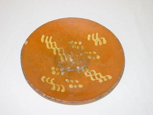 11 1/2" PA REDWARE PLATE W/ YELLOW SLIP DECORATION - GLAZE LOSSES & WEAR IN MIDDLE & SEVERAL RIM CHIPS;