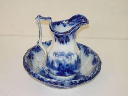 11 1/2" SCINDE FLOW BLUE PITCHER & BOWL SET BY ALCOCK- PROFESSIONAL CHIP REPAIR TO BOWL & BASE HANDLE OF PITCHER;