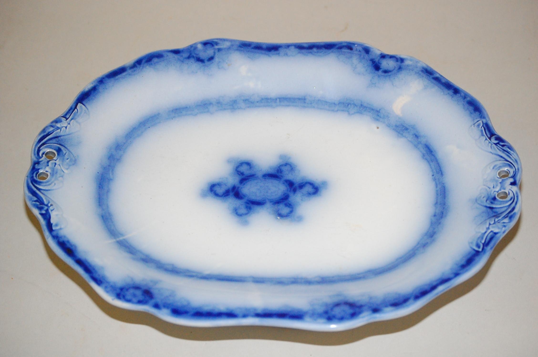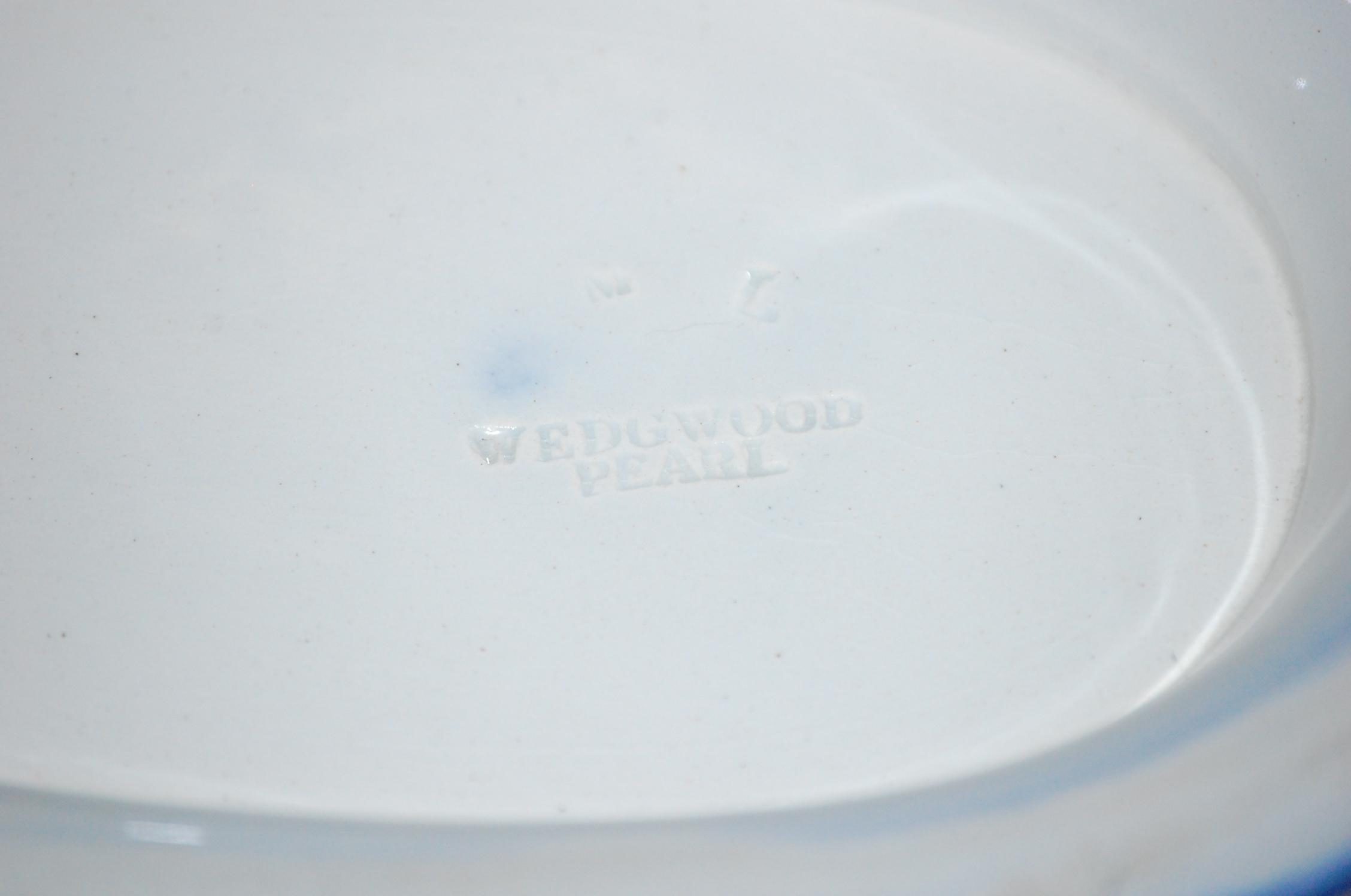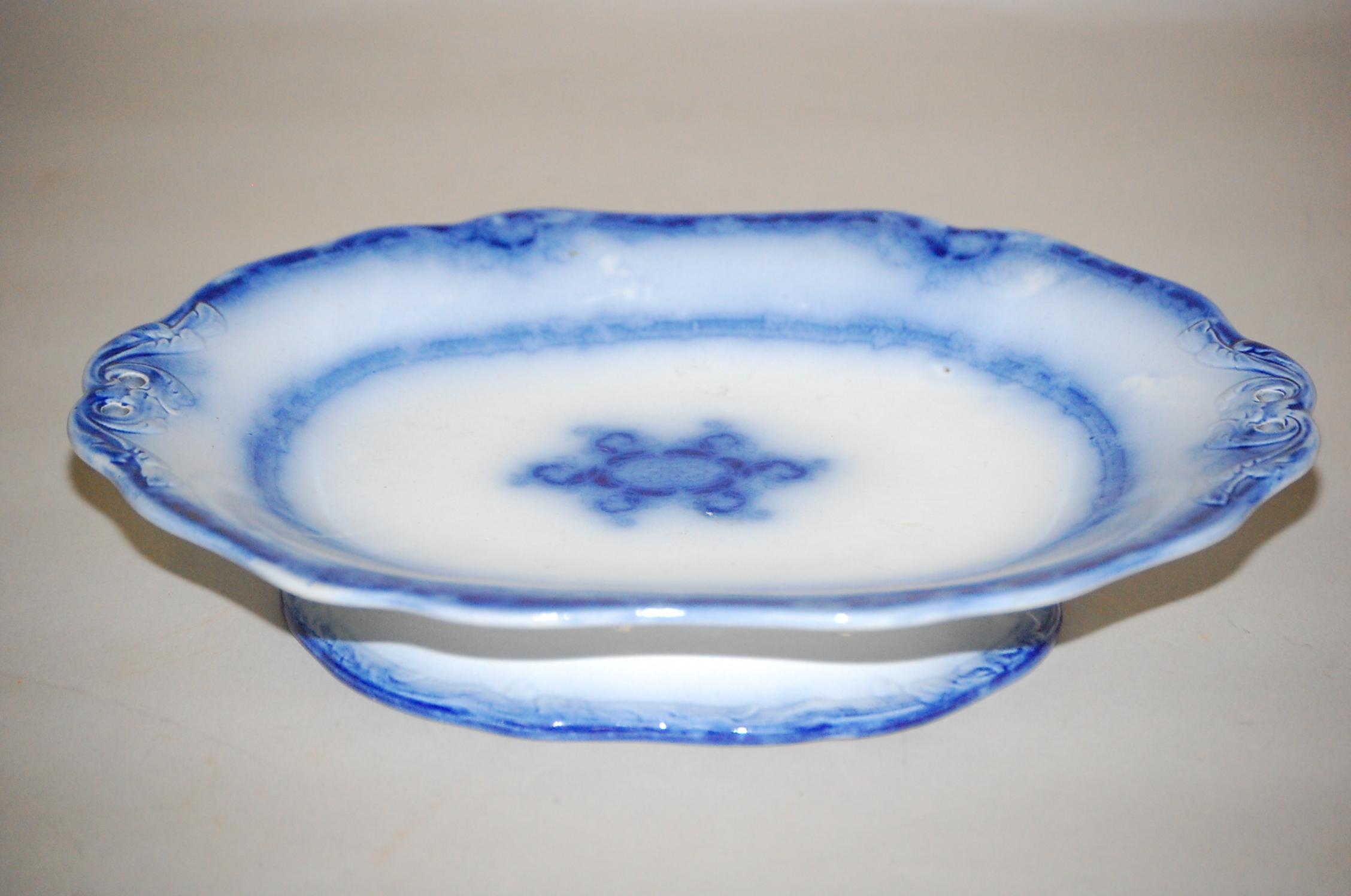 11 1/4" FLOW BLUE COMPOTE - WEDGWOOD FLOW BLUE IRONSTONE LOW COMPOTE W/ OPEN HANDLES & FLORAL CENTER-IMPRESSED WEDGWOOD PEARL (2 1/4" T X 11 1/4" L) - WEAR & IMPERFECTIONS