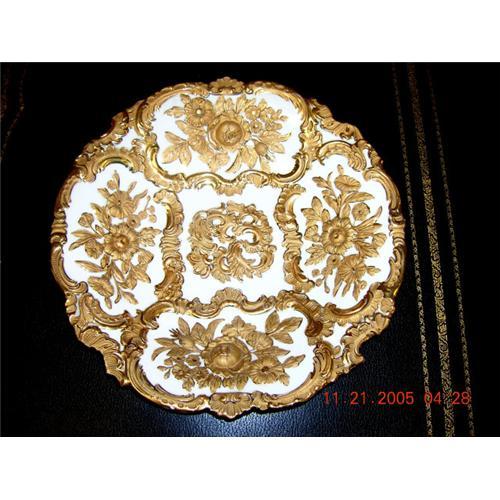 <table width="100%" border="0" cellspacing="0" cellpadding="4"><tr><td><em> </em></td></tr><tr> <td width="100%"> Stunning 11 1/4 inch Marked Gold and White Meissen Plate. Pictures don't do this piece justice. Condition very good with minimal rubbing. No cracks, chips or repairs. </td></tr><tr> <td> </td></tr><tr> <td>Reference #: R162</td></tr><tr><td>Condition:Very Good</td></tr><tr><td>Year:Unknown</td></tr><tr><td>Country:Germany</td></tr><tr><td>Maker:Meissen</td></tr><tr><td>Height:11.25</td></tr><tr><td>Depth:2</td></tr><tr><td>Width:11.25</td></tr><tr><td>Weight:1.5</td></tr><tr><td>Title:11 1/4" Gold and White Meissen Plate</td></tr><tr><td>Materials:porcelain</td></tr><tr><td>Location:Joplin, MO</td></tr></table>