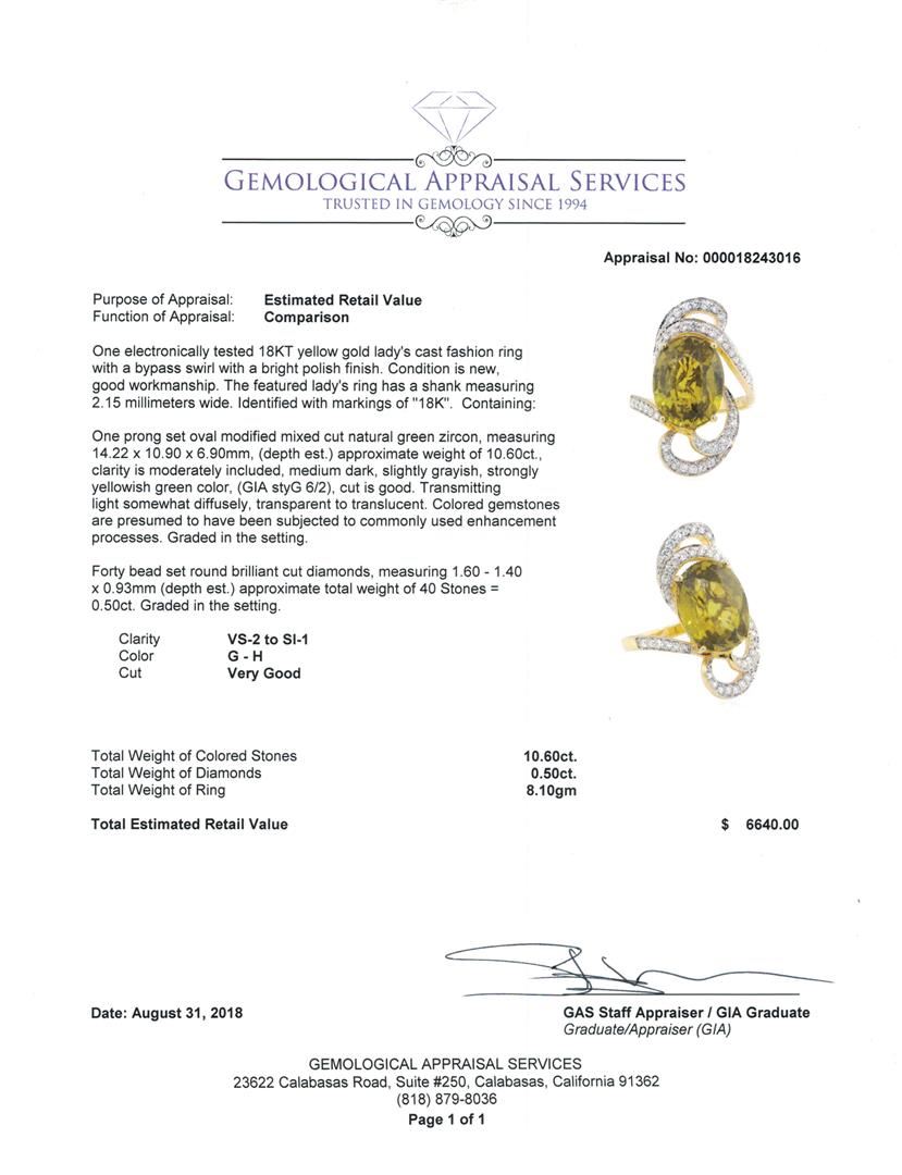 One electronically tested 18KT yellow gold lady's cast fashion ring with a bypass swirl with a bright polish finish. The featured lady's ring has a shank measuring 2.15 millimeters wide. Identified with markings of '18K'. Condition is new, good workmanship. Containing: One prong set oval modified mixed cut natural green zircon, measuring 14.22 x 10.90 x 6.90mm, (depth est.) approximate weight of 10.60ct., clarity is moderately included, medium dark, slightly grayish, strongly yellowish green color, (GIA styG 6/2), cut is good. Transmitting light somewhat diffusely, transparent to translucent. Colored gemstones are presumed to have been subjected to commonly used enhancement processes. Graded in the setting. Forty bead set round brilliant cut diamonds, measuring 1.60 - 1.40 x 0.93mm (depth est.) approximate total weight of 40 Stones = 0.50ct. Graded in the setting. Color G - H Clarity VS-2 to SI-1 Cut Very Good. Total Weight of Colored Stones 10.60ct.. Total Weight of Diamonds 0.50ct.. Total Weight of Ring 8.10gm GAS Appraised at $6640.00. GAS Appraised.