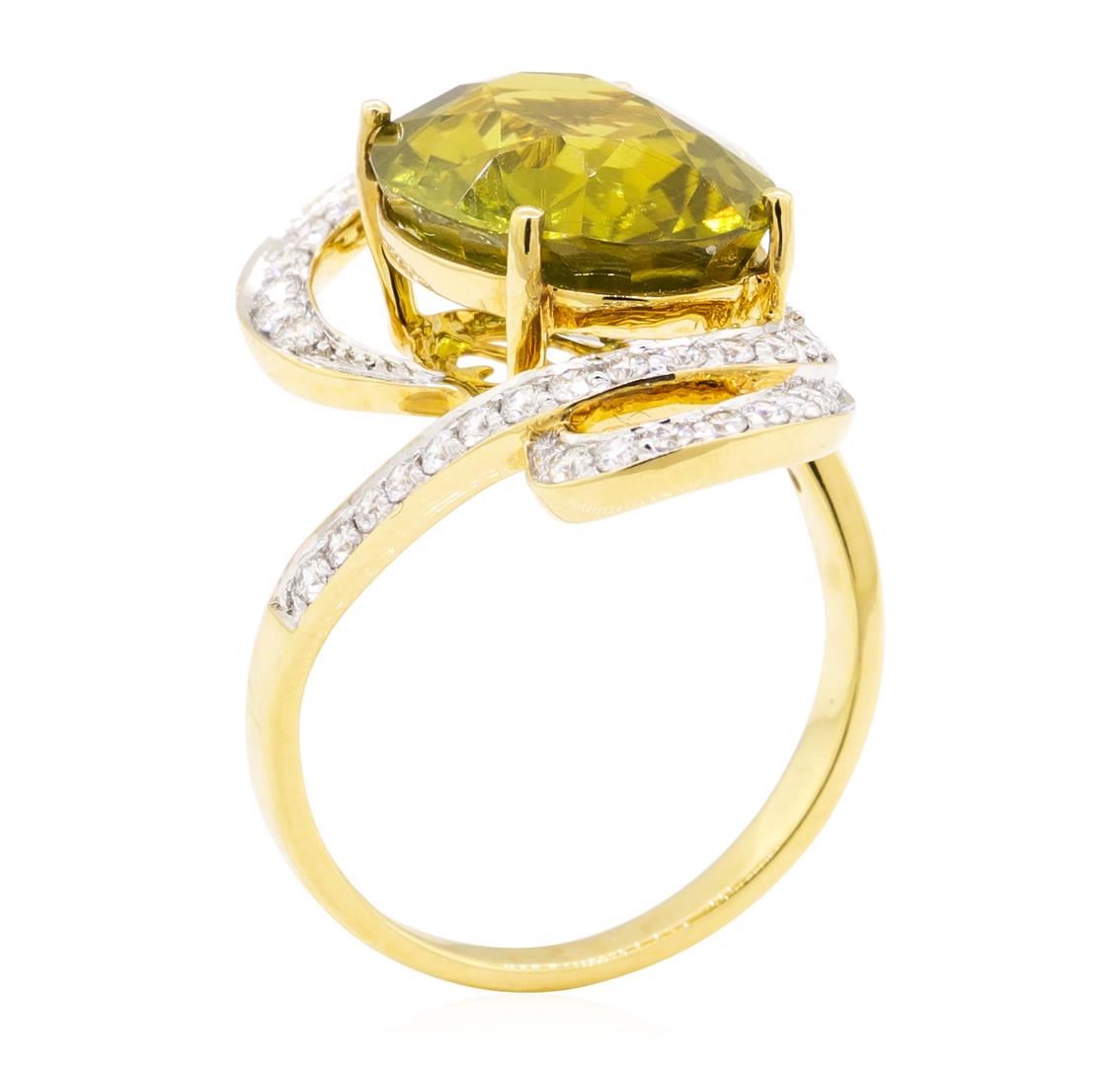 One electronically tested 18KT yellow gold lady's cast fashion ring with a bypass swirl with a bright polish finish. The featured lady's ring has a shank measuring 2.15 millimeters wide. Identified with markings of '18K'. Condition is new, good workmanship. Containing: One prong set oval modified mixed cut natural green zircon, measuring 14.22 x 10.90 x 6.90mm, (depth est.) approximate weight of 10.60ct., clarity is moderately included, medium dark, slightly grayish, strongly yellowish green color, (GIA styG 6/2), cut is good. Transmitting light somewhat diffusely, transparent to translucent. Colored gemstones are presumed to have been subjected to commonly used enhancement processes. Graded in the setting. Forty bead set round brilliant cut diamonds, measuring 1.60 - 1.40 x 0.93mm (depth est.) approximate total weight of 40 Stones = 0.50ct. Graded in the setting. Color G - H Clarity VS-2 to SI-1 Cut Very Good. Total Weight of Colored Stones 10.60ct.. Total Weight of Diamonds 0.50ct.. Total Weight of Ring 8.10gm GAS Appraised at $6640.00. GAS Appraised.