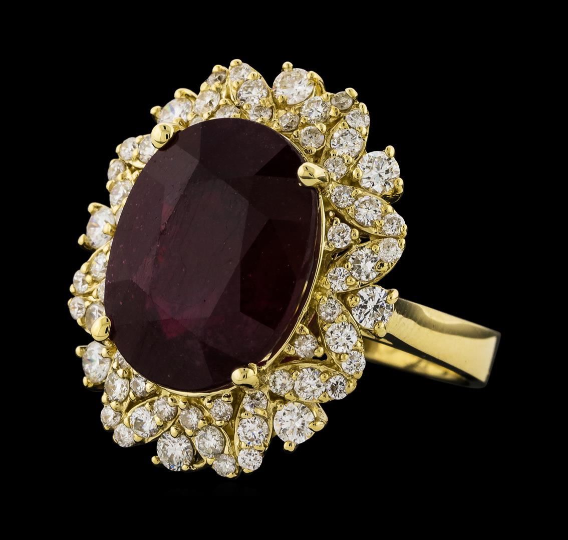 One electronically tested 14KT yellow gold lady's cast fashion ring with a staggered basket halo with a bright polish finish. The featured lady's ring has a shank measuring 3.30 millimeters wide. Identified with markings of 'K14'. Condition is new, good workmanship. Containing: One prong set oval oval modified mixed cut natural ruby, measuring 15.17 x 11.70 x 6.85mm, (depth est.) 8%. bulge factor, approximate weight of 11.11ct., clarity is heavily included, medium dark, very slightly brownish, red color, (GIA R 6/3), cut is good. Transmitting light somewhat diffusely, semi-transparent to translucent. Naturally occurring internal & external characteristics are present. Indications of laboratory high temperature heat treatment, with glass & flux additives. Colored gemstones are presumed to have been subjected to commonly used enhancement processes. Graded in the setting. Eight prong set round brilliant cut diamonds, measuring 2.30 - 2.25 x 1.41mm (depth est.) approximate total weight of 8 Stones = 0.36ct. Graded in the setting. Clarity SI-1 to SI-3. Color: H - I Cut Good Sixteen prong set round brilliant cut diamonds, measuring 1.80 - 1.75 x 1.10mm (depth est.) approximate total weight of 16 Stones = 0.35ct. Graded in the setting. Clarity SI-1 to SI-2. Color: H - I Cut Good Forty prong set round brilliant cut diamonds, measuring 1.40 - 1.35 x 0.86mm (depth est.) approximate total weight of 40 Stones = 0.40ct. Graded in the setting. Clarity SI-1 to I-1. Color: H - I Cut Good. Total Weight of Colored Stones 11.11ct.. Total Weight of Diamonds 1.11ct.. Total Weight of Ring 9.10gm. GAS Appraised at $7,970.00.