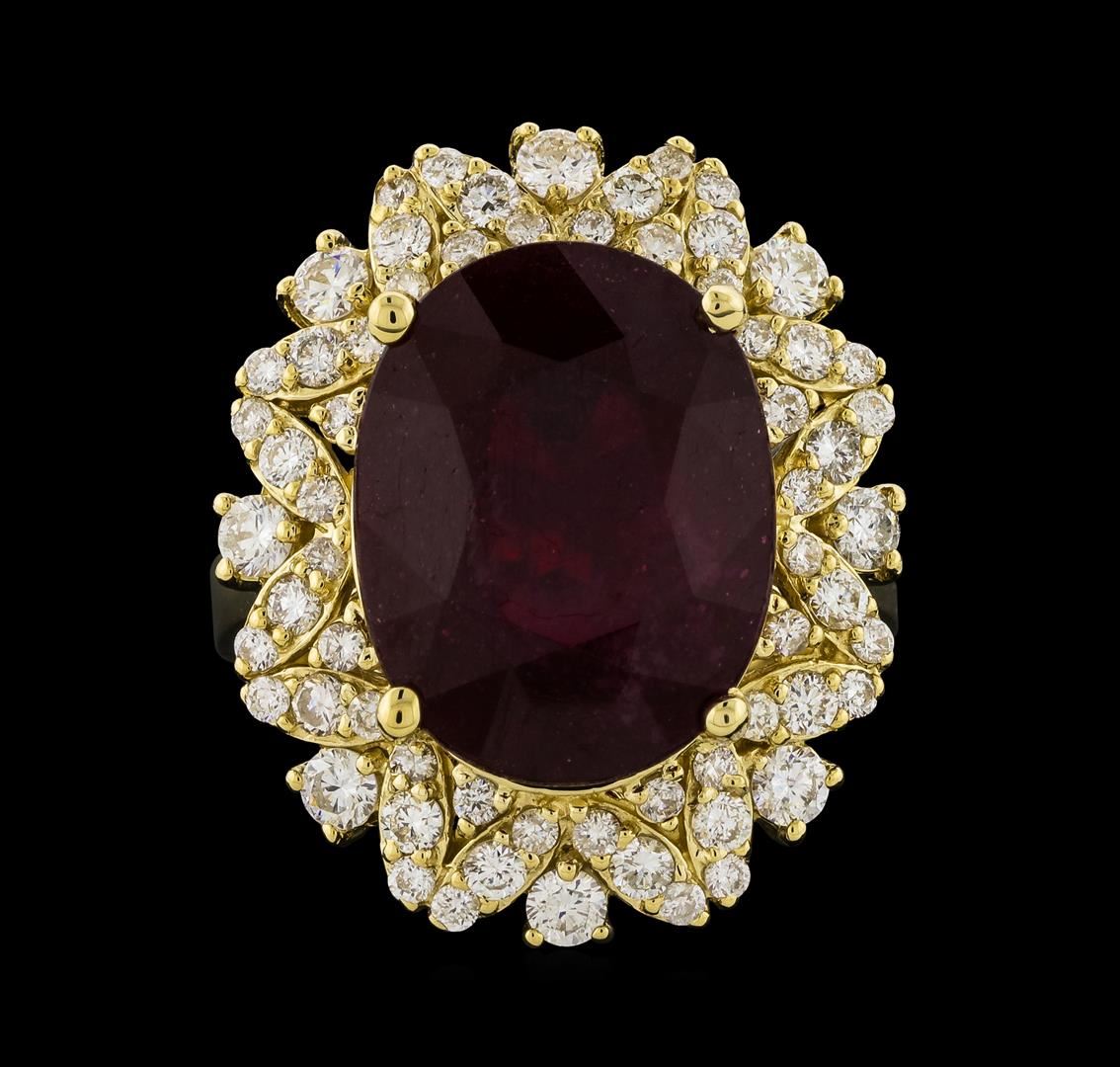 One electronically tested 14KT yellow gold lady's cast fashion ring with a staggered basket halo with a bright polish finish. The featured lady's ring has a shank measuring 3.30 millimeters wide. Identified with markings of 'K14'. Condition is new, good workmanship. Containing: One prong set oval oval modified mixed cut natural ruby, measuring 15.17 x 11.70 x 6.85mm, (depth est.) 8%. bulge factor, approximate weight of 11.11ct., clarity is heavily included, medium dark, very slightly brownish, red color, (GIA R 6/3), cut is good. Transmitting light somewhat diffusely, semi-transparent to translucent. Naturally occurring internal & external characteristics are present. Indications of laboratory high temperature heat treatment, with glass & flux additives. Colored gemstones are presumed to have been subjected to commonly used enhancement processes. Graded in the setting. Eight prong set round brilliant cut diamonds, measuring 2.30 - 2.25 x 1.41mm (depth est.) approximate total weight of 8 Stones = 0.36ct. Graded in the setting. Clarity SI-1 to SI-3. Color: H - I Cut Good Sixteen prong set round brilliant cut diamonds, measuring 1.80 - 1.75 x 1.10mm (depth est.) approximate total weight of 16 Stones = 0.35ct. Graded in the setting. Clarity SI-1 to SI-2. Color: H - I Cut Good Forty prong set round brilliant cut diamonds, measuring 1.40 - 1.35 x 0.86mm (depth est.) approximate total weight of 40 Stones = 0.40ct. Graded in the setting. Clarity SI-1 to I-1. Color: H - I Cut Good. Total Weight of Colored Stones 11.11ct.. Total Weight of Diamonds 1.11ct.. Total Weight of Ring 9.10gm. GAS Appraised at $7,970.00.
