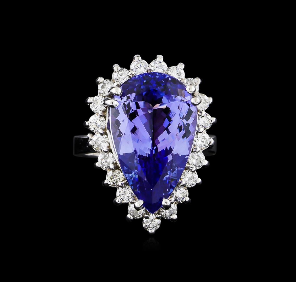One electronically tested 14KT white gold ladies cast tanzanite and diamond ring with a bright polish finish. The featured tanzanite is set within a diamond floret supported by a ribbed under gallery, completed by a three millimeter wide band. Identified with markings of "K14". Condition is new, good workmanship. Containing: One prong set pear mixed cut natural tanzanite, measuring 18.90 x 11.70 x 7.50mm, approximate weight of 11.11ct., clarity is eye clean, type I, medium dark, very slightly grayish, bluish violet color, (GIA bV 6/3), cut is good. Transmitting light with no distortion, transparent. Colored Stone Grading Report attached. Graded in the setting. Tanzanite is a very rare gemstone that is only found in the country of Tanzania. Originally discovered in 1967. Tiffany & Company, named the stone Tanzanite. It is found in the Usumburu Mountains that border the Umba Valley of northern Tanzania. Tanzanite occurs in gray, brown, violet, blue, reddish-purple, & green. The gem is interesting because of its exceptional pleochroism. Rotated in different directions a tanzanite will exhibit multiple changes of color. Tanzanite has a low tolerance to ultrasonic cleaning, and should not be cleaned using this method. Twenty-One prong set round brilliant cut diamonds, measuring 2.40 - 2.40 x 1.44mm (depth est.) approximate total weight of 21 Stones = 1.06ct. Graded in the setting. Clarity: SI-2 to I-2. Color: G - I. Total Weight of Colored Stones 11.11ct. Total Weight of Diamonds 1.06ct. Total Weight of Ring 9.50gm. AIG Appraised at $28,915.00.