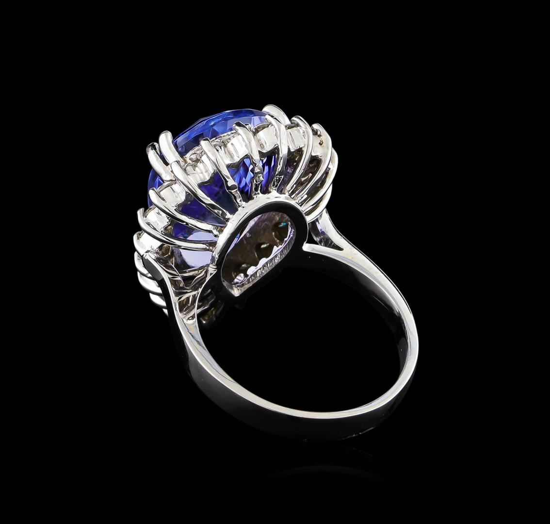 One electronically tested 14KT white gold ladies cast tanzanite and diamond ring with a bright polish finish. The featured tanzanite is set within a diamond floret supported by a ribbed under gallery, completed by a three millimeter wide band. Identified with markings of "K14". Condition is new, good workmanship. Containing: One prong set pear mixed cut natural tanzanite, measuring 18.90 x 11.70 x 7.50mm, approximate weight of 11.11ct., clarity is eye clean, type I, medium dark, very slightly grayish, bluish violet color, (GIA bV 6/3), cut is good. Transmitting light with no distortion, transparent. Colored Stone Grading Report attached. Graded in the setting. Tanzanite is a very rare gemstone that is only found in the country of Tanzania. Originally discovered in 1967. Tiffany & Company, named the stone Tanzanite. It is found in the Usumburu Mountains that border the Umba Valley of northern Tanzania. Tanzanite occurs in gray, brown, violet, blue, reddish-purple, & green. The gem is interesting because of its exceptional pleochroism. Rotated in different directions a tanzanite will exhibit multiple changes of color. Tanzanite has a low tolerance to ultrasonic cleaning, and should not be cleaned using this method. Twenty-One prong set round brilliant cut diamonds, measuring 2.40 - 2.40 x 1.44mm (depth est.) approximate total weight of 21 Stones = 1.06ct. Graded in the setting. Clarity: SI-2 to I-2. Color: G - I. Total Weight of Colored Stones 11.11ct. Total Weight of Diamonds 1.06ct. Total Weight of Ring 9.50gm. AIG Appraised at $28,915.00.