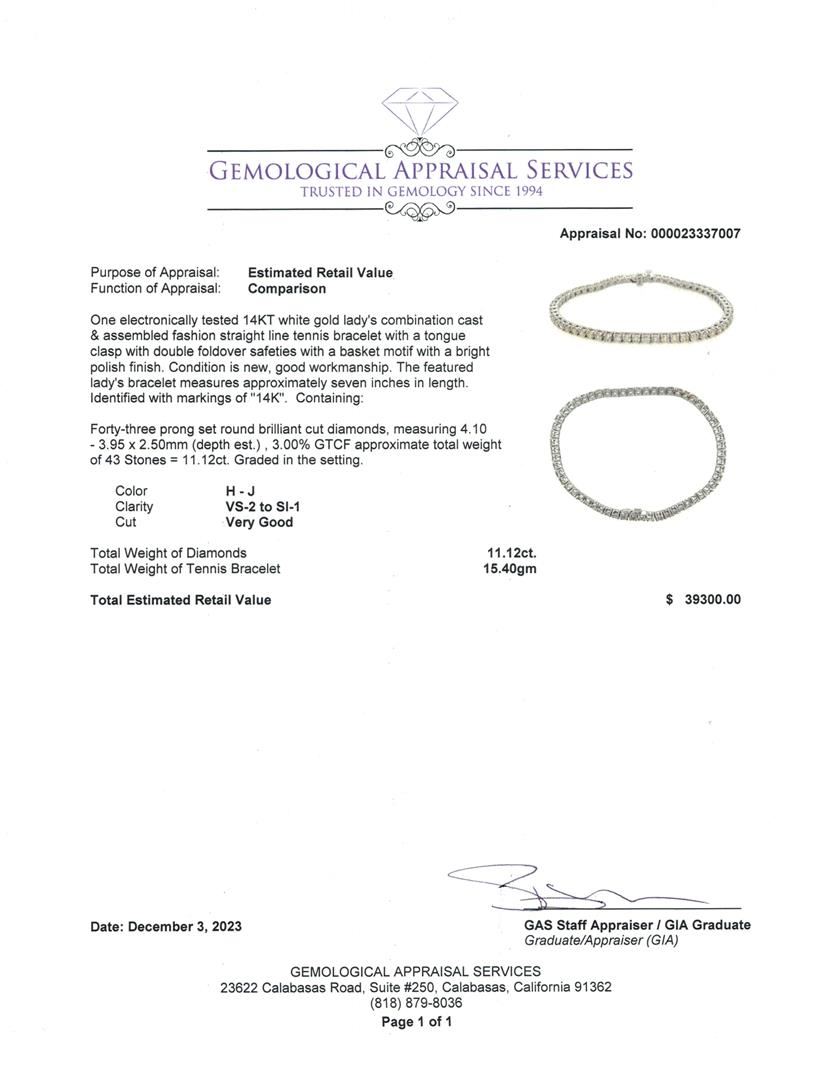 One new 11.12 ctw Diamond Tennis Bracelet - 14KT White Gold. Appraisal Value: $39300. See appraisal for full details.