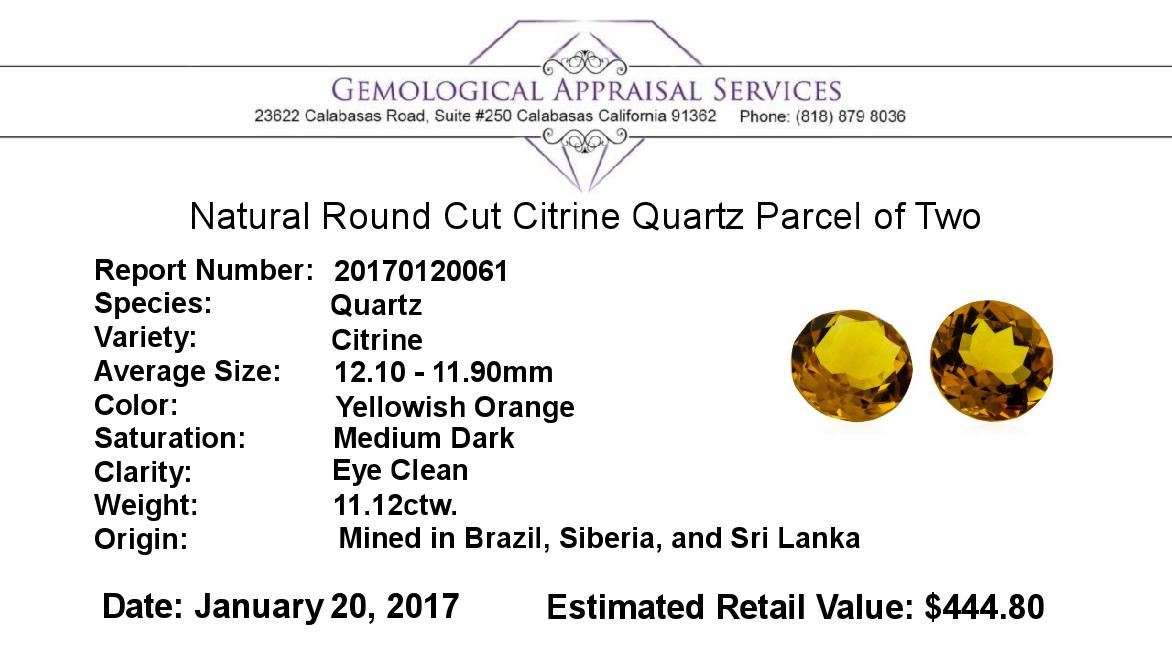 One natural round cut citrine quartz parcel of two with an exact weight of 11.12ctw., clarity is eye clean, yellowish orange, medium dark. Gemological Appraisals Services estimates the retail value at $444.8 GAS Appraised.