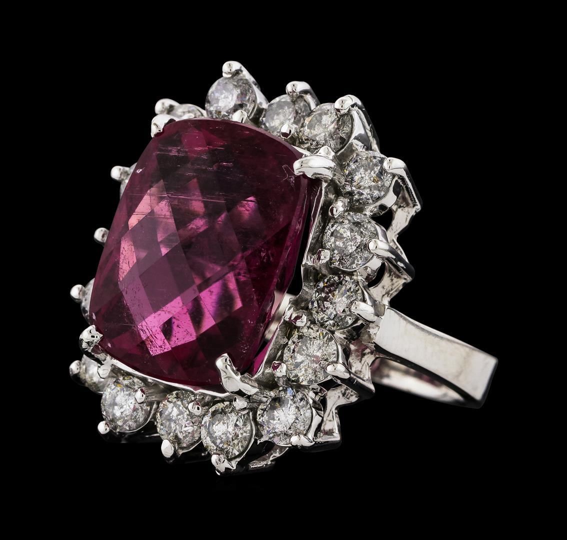 One 14KT White Gold "One of a Kind" Lady's Ring, 11.40 grams. Containing: Main Gemstones: Identity: Natural Tourmaline. Carat Weight: 11.12 cts tw. Shape & Measurement: Cushion Checker Cut. Quality: Fine color and cutting. Adjacent Gemstones: Identity: Natural Diamonds. Shape: Round Brilliant Cut. Carat Weight: 2.37 cts tw. Quality: SI Clarity, G-H Color. All fine cutting and proportions. Total Gemstones Weight: 13.49 cts tw. RBGS Appraised.