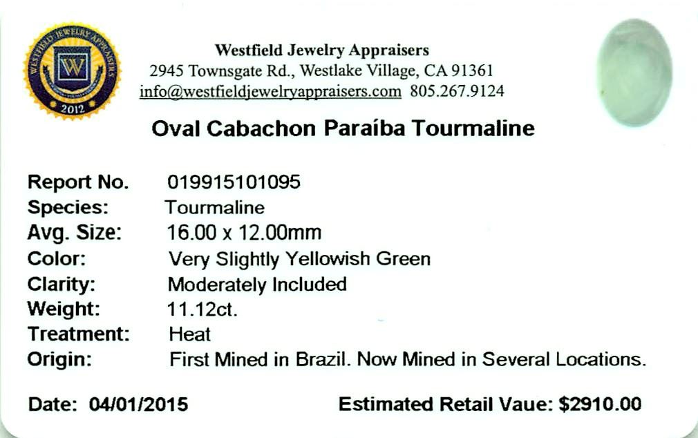 One oval cabochon cut natural Paraiba tourmaline exact weight 11.12ct., clarity is moderately included, cut is good. Westfield Appraised at $2,910.00.