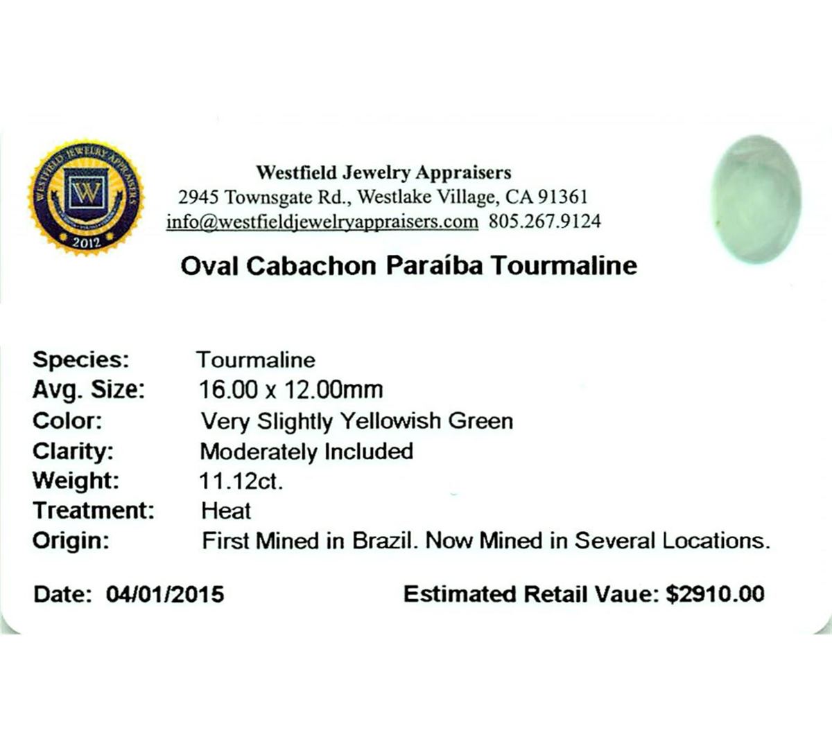 One oval cabochon cut natural Paraiba tourmaline exact weight 11.12ct., clarity is moderately included, cut is good. Westfield Appraised at $2,910.00.