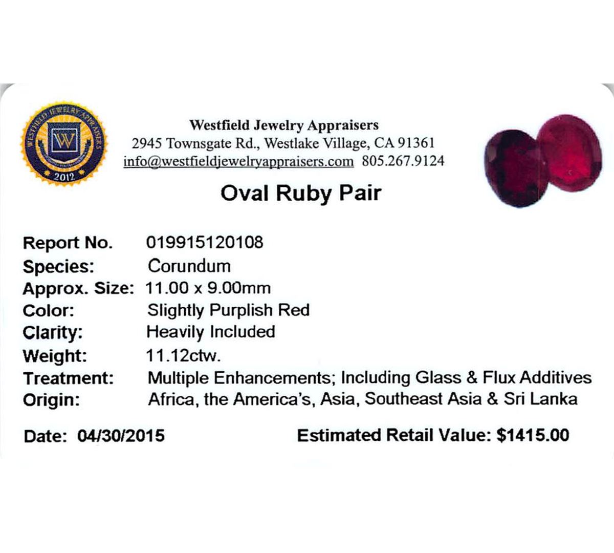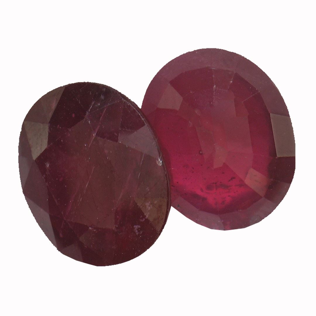 Two oval mixed cut natural rubies exact total weight 11.12ct., clarity is heavily included, type II, dark, very slightly brownish, slightly purplish red color, (GIA slpR 7/3), cut is good. Westfield Appraised at $1,415.00.