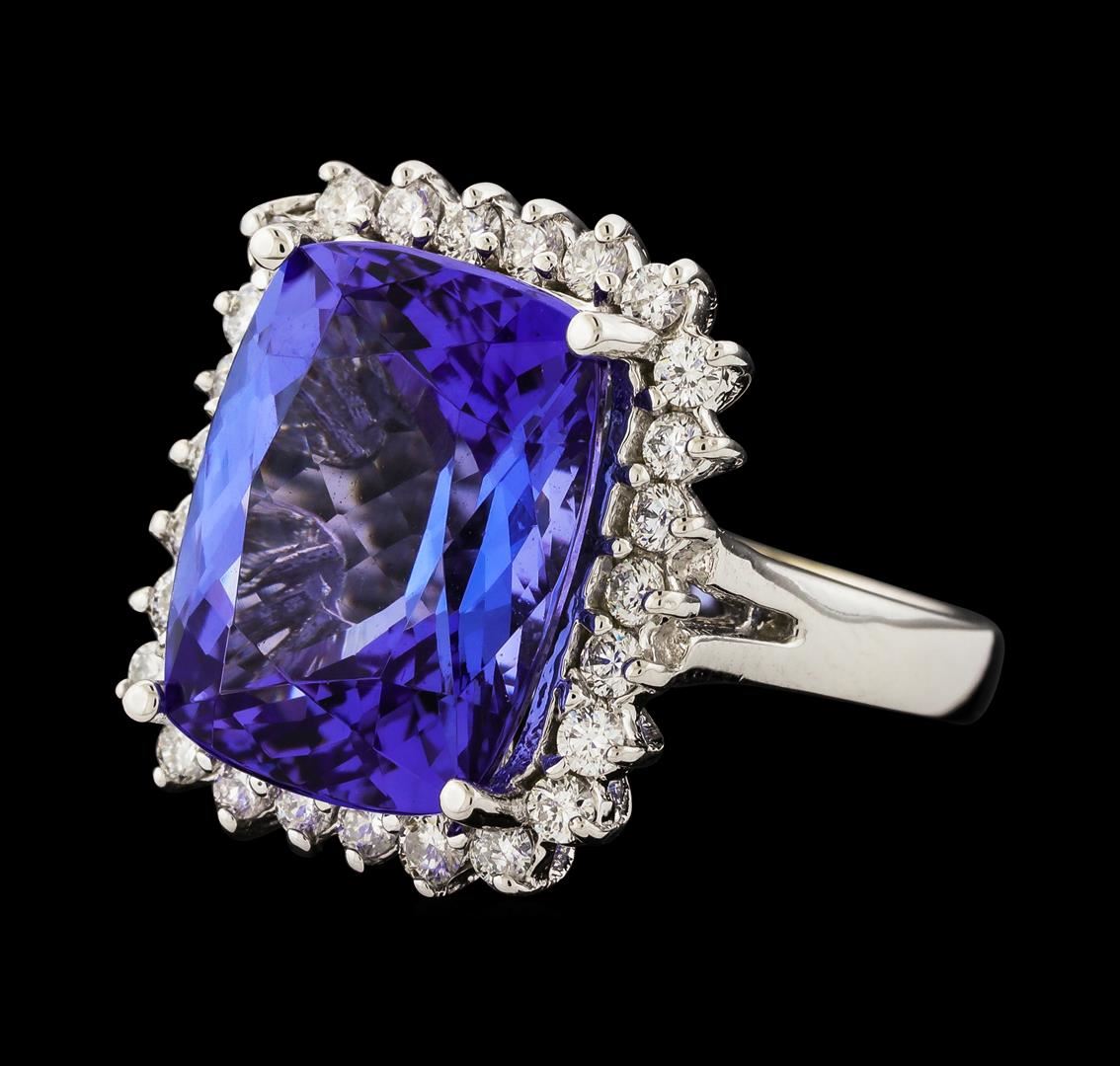 One electronically tested 14KT white gold lady's cast fashion ring with a basket halo with a bright polish finish. The featured lady's ring has a shank measuring 2.73 millimeters wide. Identified with markings of '14K'. Condition is new, good workmanship. Containing: One prong set rectangular cushion modified brilliant cut natural tanzanite, measuring 14.85 x 11.89 x 7.86mm, (depth est.) approximate weight of 11.13ct., clarity is eye clean, medium, moderately strong, bluish violet color, (GIA bV 5/4), cut is very good. Transmitting light with no distortion, transparent. Colored gemstones are presumed to have been subjected to commonly used enhancement processes. Graded in the setting. Twenty-Six prong set round brilliant cut diamonds, measuring 1.90 - 1.85 x 1.17mm (depth est.) approximate total weight of 26 Stones = 0.65ct. Graded in the setting. Clarity VS-2 to SI-2. Color: G - H Cut Good. Total Weight of Colored Stones 11.13ct.. Total Weight of Diamonds 0.65ct.. Total Weight of Ring 8.10gm. GAS Appraised at $18,000.00.
