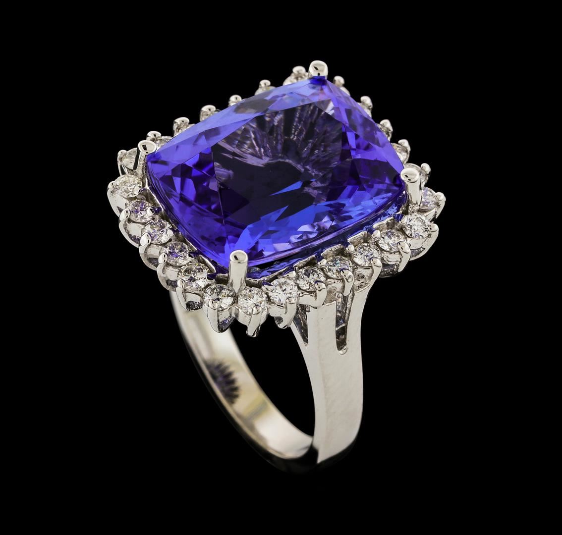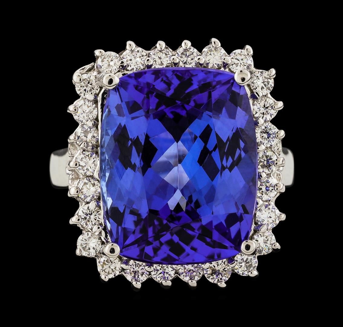 One electronically tested 14KT white gold lady's cast fashion ring with a basket halo with a bright polish finish. The featured lady's ring has a shank measuring 2.73 millimeters wide. Identified with markings of '14K'. Condition is new, good workmanship. Containing: One prong set rectangular cushion modified brilliant cut natural tanzanite, measuring 14.85 x 11.89 x 7.86mm, (depth est.) approximate weight of 11.13ct., clarity is eye clean, medium, moderately strong, bluish violet color, (GIA bV 5/4), cut is very good. Transmitting light with no distortion, transparent. Colored gemstones are presumed to have been subjected to commonly used enhancement processes. Graded in the setting. Twenty-Six prong set round brilliant cut diamonds, measuring 1.90 - 1.85 x 1.17mm (depth est.) approximate total weight of 26 Stones = 0.65ct. Graded in the setting. Clarity VS-2 to SI-2. Color: G - H Cut Good. Total Weight of Colored Stones 11.13ct.. Total Weight of Diamonds 0.65ct.. Total Weight of Ring 8.10gm. GAS Appraised at $18,000.00.
