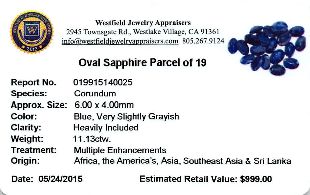Nineteen oval mixed cut natural blue sapphires, measuring 6.00 x 4.00 x 2.60mm, exact total weight 11.13ct., clarity is heavily included, type II, dark, very slightly grayish, blue color, (GIA B 7/3), cut is good. Indications of multiple laboratory enhancements, including high temperature heat treatment. Westfield Appraised at $998.82.