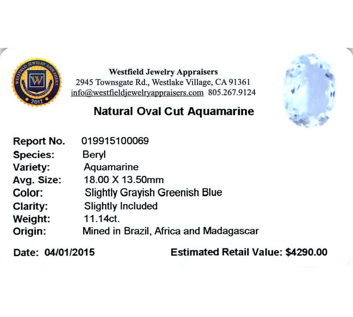 One oval cut natural aquamarine exact weight 11.14ct., clarity is slightly included, type I, medium light, very slightly grayish, very slightly greenish blue color, (GIA vslgB 4/3), cut is good. Westfield Appraised at $4,290.00.