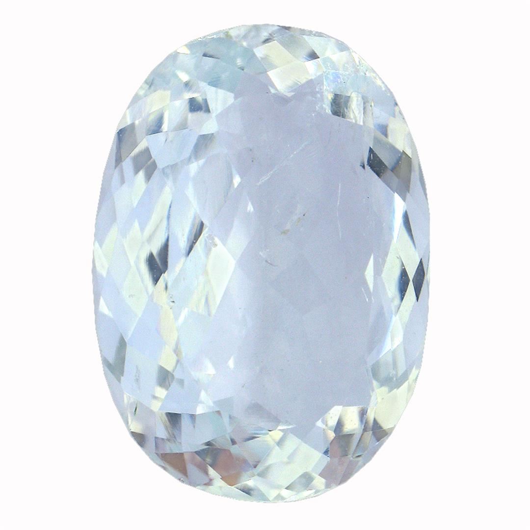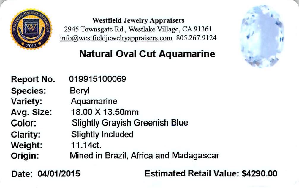 One oval cut natural aquamarine exact weight 11.14ct., clarity is slightly included, type I, medium light, very slightly grayish, very slightly greenish blue color, (GIA vslgB 4/3), cut is good. Westfield Appraised at $4,290.00.