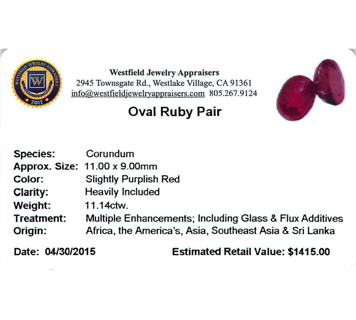 Two oval mixed cut natural rubies exact total weight 11.14ct., clarity is heavily included, type II, dark, very slightly brownish, slightly purplish red color, (GIA slpR 7/3), cut is good. Westfield Appraised at $1,415.00.
