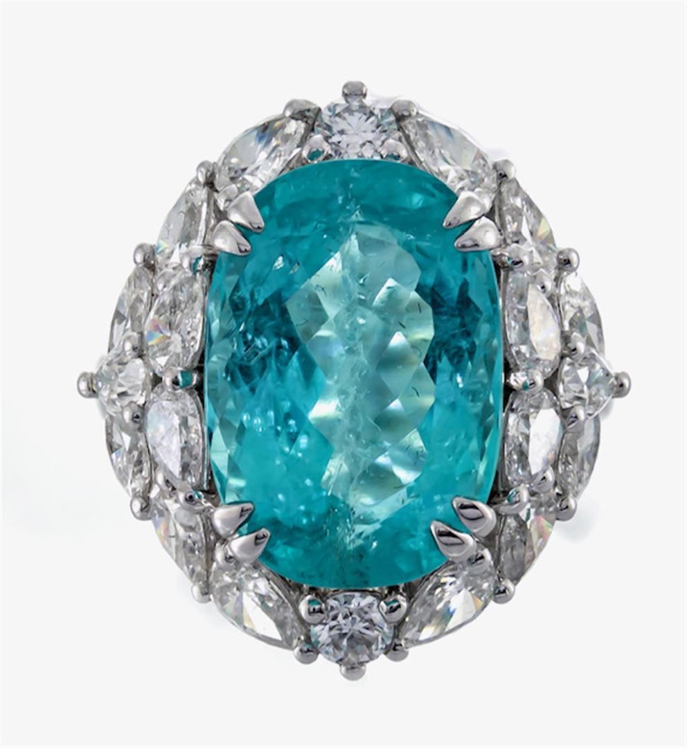 One ring featuring: 18KT White Gold weighing 8.08 grams containing one oval cut Paraiba Tourmaline with a total weight of 11.15 ct and diamonds weighing a total of 3.11 ctw.