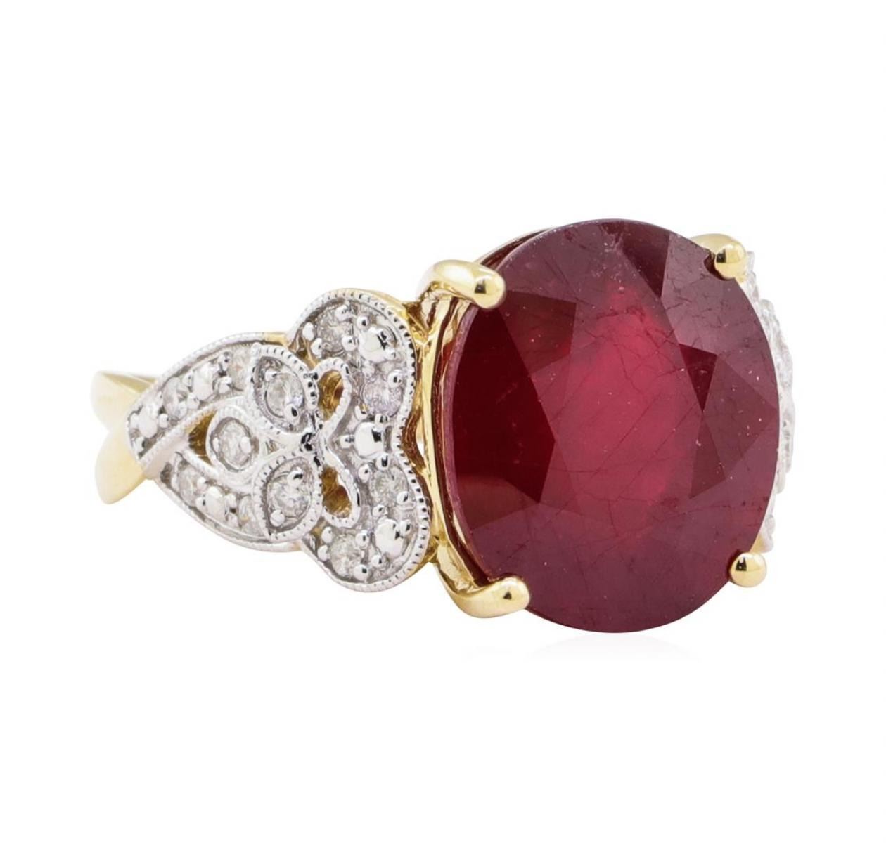 One electronically tested 14KT yellow gold ladies cast ruby & diamond ring. Conditions new, good workmanship. The featured ruby is set within diamond set shoulders supported by an elaborate lattice under gallery, completed by a two millimeter wide band. Bright polish ?nish with rhodium accents and milgrain detailing throughout. Trademark is Oriannc. Identi?ed with markings of "14K". Containing: One prong set oval cut natural ruby, measuring 13.40 x 11.60 x 7.80mm, approximate weight of 11.15ct., clarity is heavily included, type II, medium dark, strong, red color, (GIA R 6/5), cut is good. Transmitting light with a minimum of distortion, transparent. Naturally occurring internal & external characteristics are present. Indications of laboratory high temperature heat treatment, with glass & ?ux additives. Graded in the setting. Ruby has a low tolerance to rhodium plating, repolishing the surface, & ultrasonic cleaning. Twenty-two bead set round brilliant cut diamonds, measuring 1.40 - 1.40 x 0.84mm (depth est) approximate total Weight of 22 Stones = 0.25ct. Graded in the setting. Clarity SI-1 to I-1 Color F - H Total Weight of Colored Stones 11.15ct. Total Weight of Diamonds 0.25ct. Total Weight of Ring 7.40 gm Total Estimated Retail Value 3,000.00 US