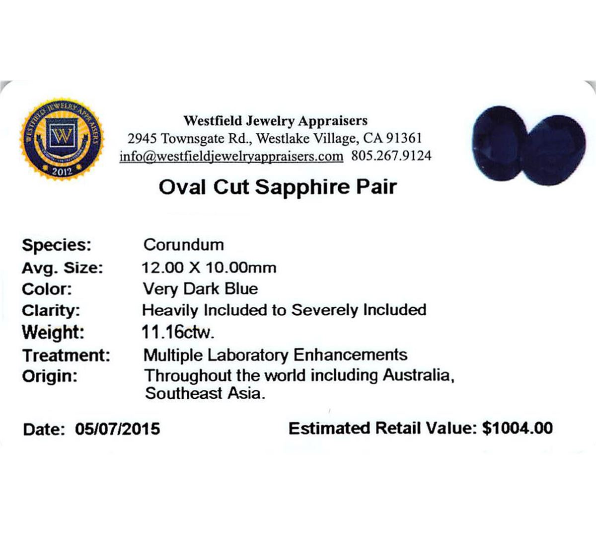 Two oval cut sapphires, measuring 12.00 x 10.00mm, approximate total weight of 11.16ct., clarity is heavily included to severely included, very dark blue color. Indications of multiple laboratory enhancements. Westfield Appraised at $1,004.00.