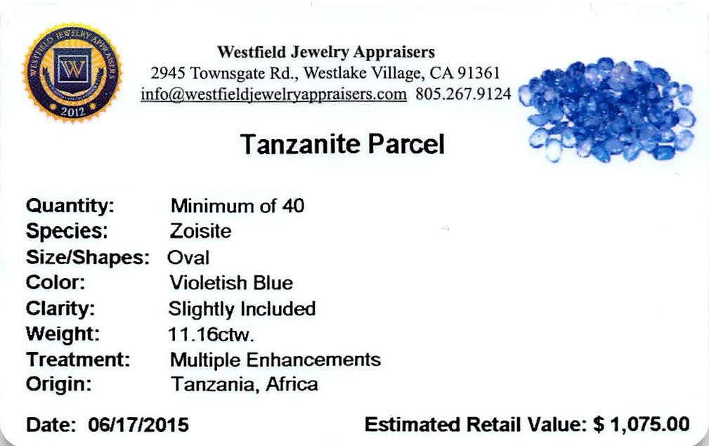 Forty oval mixed cut natural tanzanites exact total weight 11.16ct., clarity is slightly included, type I, medium dark, very slightly grayish, violetish blue color, (GIA vB 6/3), cut is good. Measurements & the color grade are an average for the group, Color grade is an average for the group, Transmitting light with no distortion, transparent, Indications of laboratory high temperature heat treatment. Westfield Appraised at $1,075.00.