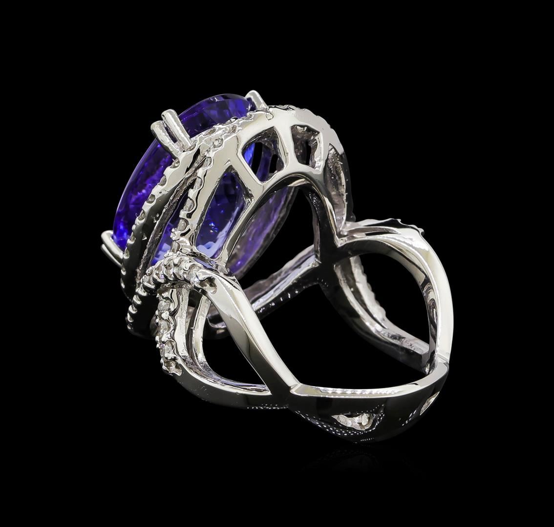 One electronically tested 14KT white gold lady's cast fashion ring with a crossover split shank with a bright polish finish. The featured lady's ring has a double halo and a double shank measuring 5.20 millimeters wide. Identified with markings of 'K14'. Condition is new, good workmanship. Containing: One prong set oval modified brilliant cut natural tanzanite, measuring 17.07 x 12.08 x 7.31mm, (depth est.) 5%. bulge factor, approximate weight of 11.16ct., clarity is eye clean, medium, moderately strong, violetish blue color, (GIA vB 5/4), cut is very good. Transmitting light with no distortion, transparent. Colored gemstones are presumed to have been subjected to commonly used enhancement processes. Graded in the setting. Fifty-Two prong set round brilliant cut diamonds, measuring 1.60 - 1.50 x 0.96mm (depth est.) approximate total weight of 52 Stones = 0.74ct. Graded in the setting. Clarity SI-1 to SI-2. Color: H - I Cut Good Thirty-Four prong set round brilliant cut diamonds, measuring 1.40 - 1.35 x 0.86mm (depth est.) approximate total weight of 34 Stones = 0.34ct. Graded in the setting. Clarity SI-1 to SI-2. Color: H - I Cut Good. Total Weight of Colored Stones 11.16ct.. Total Weight of Diamonds 1.08ct.. Total Weight of Ring 12.40gm GAS Appraised at $23,785.00.