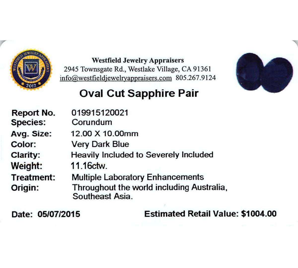 Two oval cut sapphires, measuring 12.00 x 10.00mm, approximate total weight of 11.16ct., clarity is heavily included to severely included, very dark blue color. Indications of multiple laboratory enhancements. Westfield Appraised at $1,004.00.