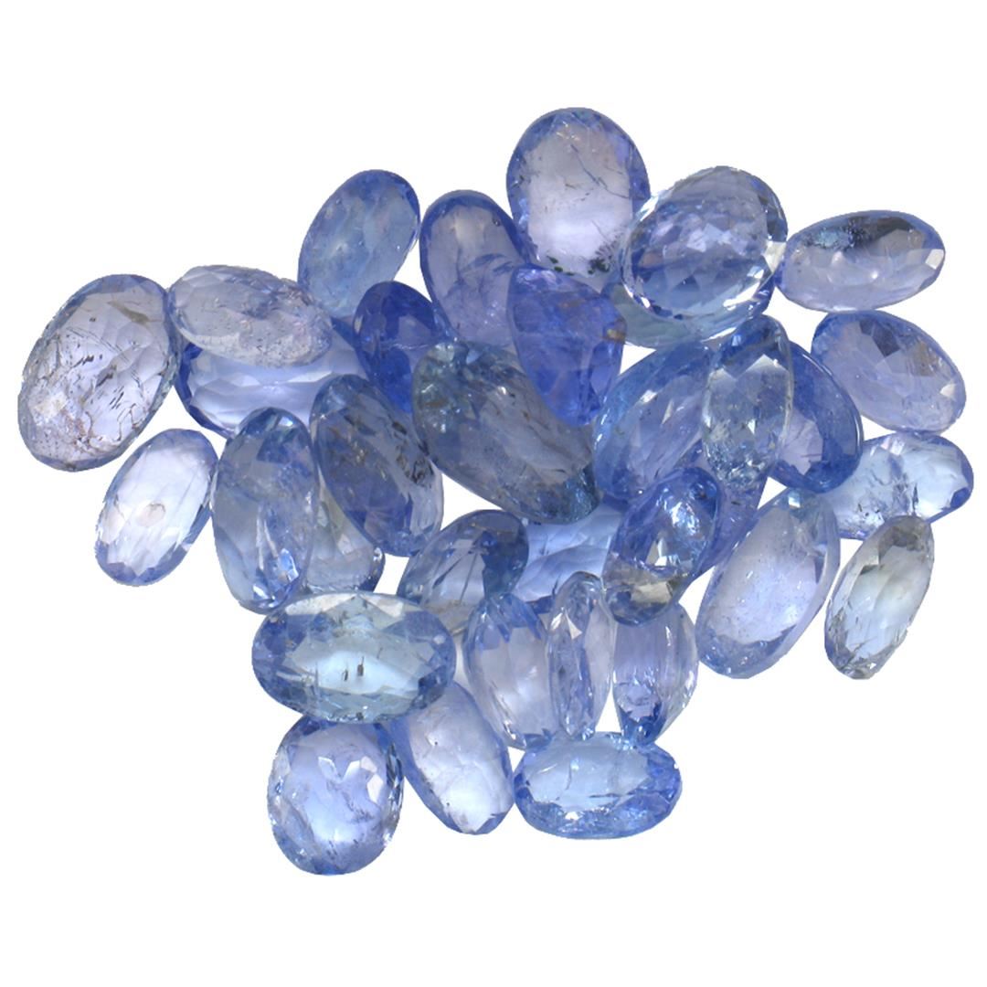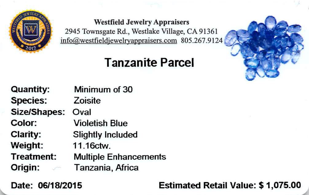 Thirty oval mixed cut natural tanzanites exact total weight 11.16ct., clarity is slightly included, type I, medium, slightly grayish, violetish blue color, (GIA vB 5/2), cut is good. Measurements & the color grade are an average for the group, Color grade is an average for the group, Naturally occurring internal & external characteristics are present, Indications of laboratory high temperature heat treatment. Westfield Appraised at $1,075.00.