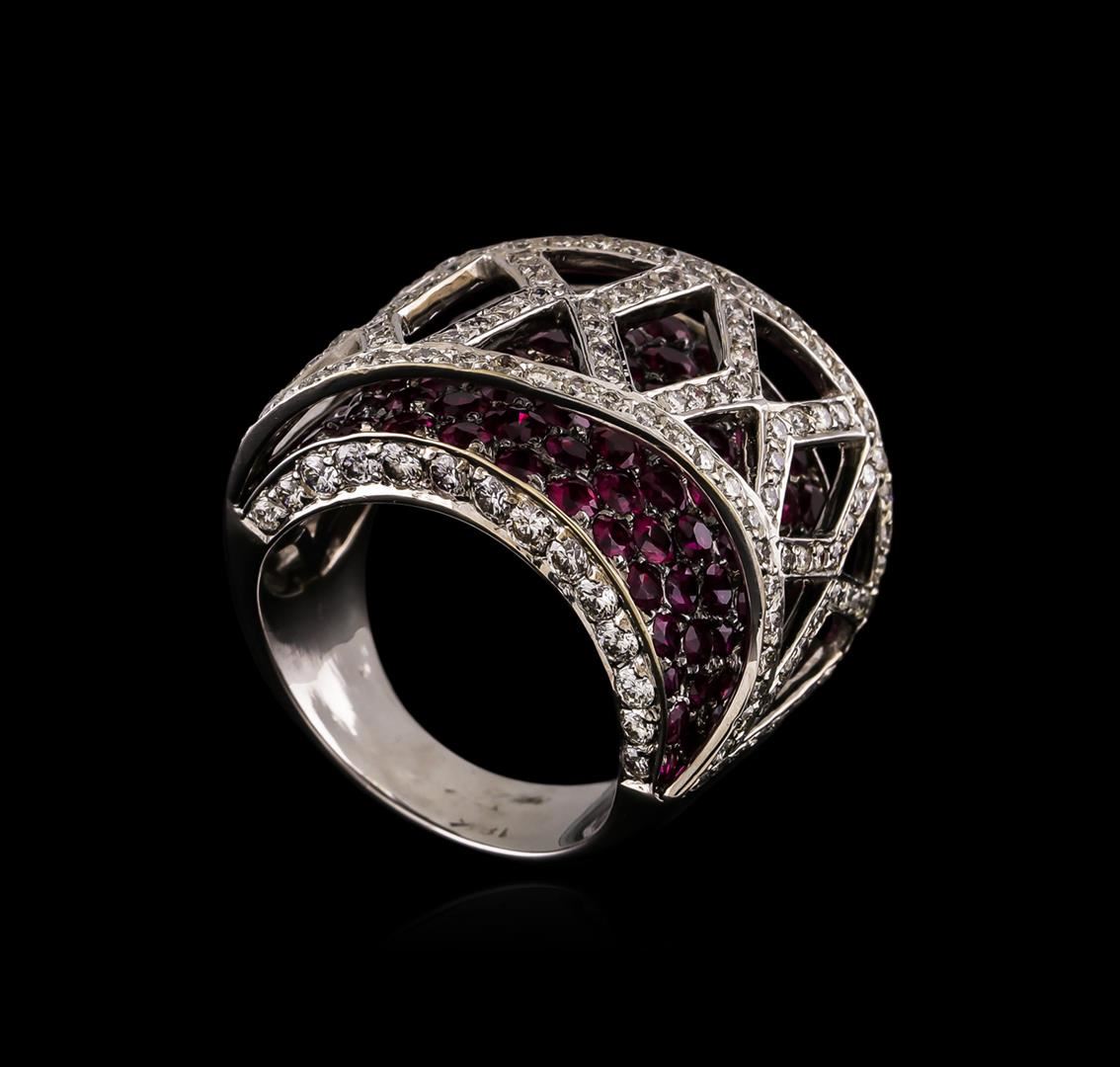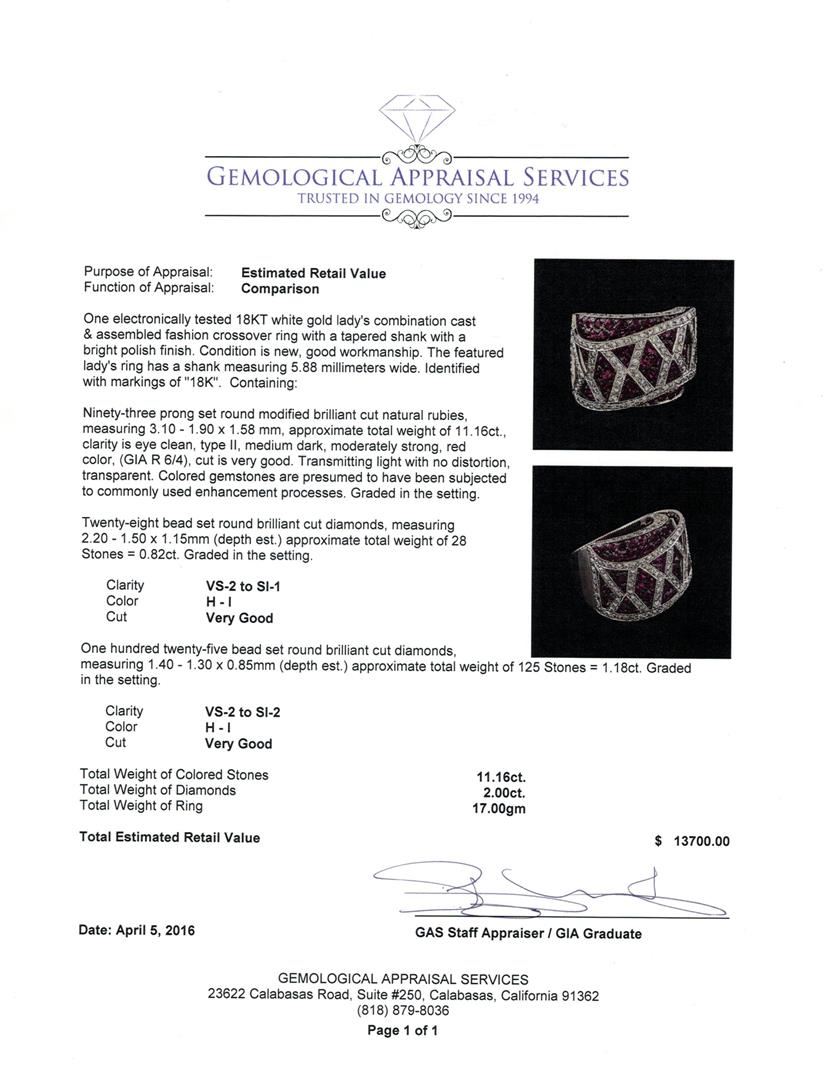 One electronically tested 18KT white gold lady's combination cast & assembled fashion crossover ring with a tapered shank with a bright polish finish. The featured lady's ring has a shank measuring 5.88 millimeters wide. Identified with markings of "18K". Condition is new, good workmanship. Containing: Ninety-three prong set round modified brilliant cut natural rubies, measuring 3.10 - 1.90 x 1.58 mm, approximate total weight of 11.16ct., clarity is eye clean, type II, medium dark, moderately strong, red color, (GIA R 6/4), cut is very good. Transmitting light with no distortion, transparent. Colored gemstones are presumed to have been subjected to commonly used enhancement processes. Graded in the setting. Twenty-Eight bead set round brilliant cut diamonds, measuring 2.20 - 1.50 x 1.15mm (depth est.) approximate total weight of 28 Stones = 0.82ct. Graded in the setting. Clarity: VS-2 to SI-1. Color: H - I. Cut Very Good One Hundred Twenty-Five bead set round brilliant cut diamonds, measuring 1.40 - 1.30 x 0.85mm (depth est.) approximate total weight of 125 Stones = 1.18ct. Graded in the setting. Clarity: VS-2 to SI-2. Color: H - I. Cut Very Good. Total Weight of Colored Stones 11.16ct. Total Weight of Diamonds 2.00ct. Total Weight of Ring 17.00gm. GAS Appraised at $13,700.00.