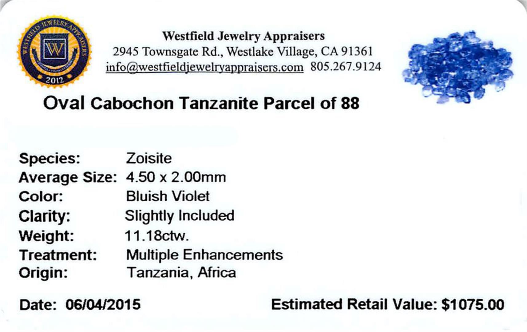 Eighty-eight oval mixed cut natural tanzanites, measuring 4.50 x 2.00 x 1.30mm, exact total weight 11.18ct., clarity is slightly included, type I, medium, very slightly grayish, bluish violet color, (GIA bV 5/3), cut is good. Transmitting light with a minimum of distortion, transparent, Naturally occurring internal & external characteristics are present. Measurements & the color grade are an average for the group. Tanzanite is a very rare gemstone that is only found in the country of Tanzania. Originally discovered in 1967. Tiffany & Company, named the stone Tanzanite. It is found in the Usumburu Mountains that border the Umba Valley of northern Tanzania. Tanzanite occurs in gray, brown, violet, blue, reddish-purple, & green. The gem is interesting because of its exceptional pleochroism. Rotated in different directions a tanzanite will exhibit multiple changes of color. Tanzanite has a low tolerance to ultrasonic cleaning, and should not be cleaned using this method. Westfield Appraised at $1,075.00.