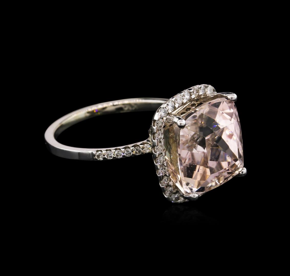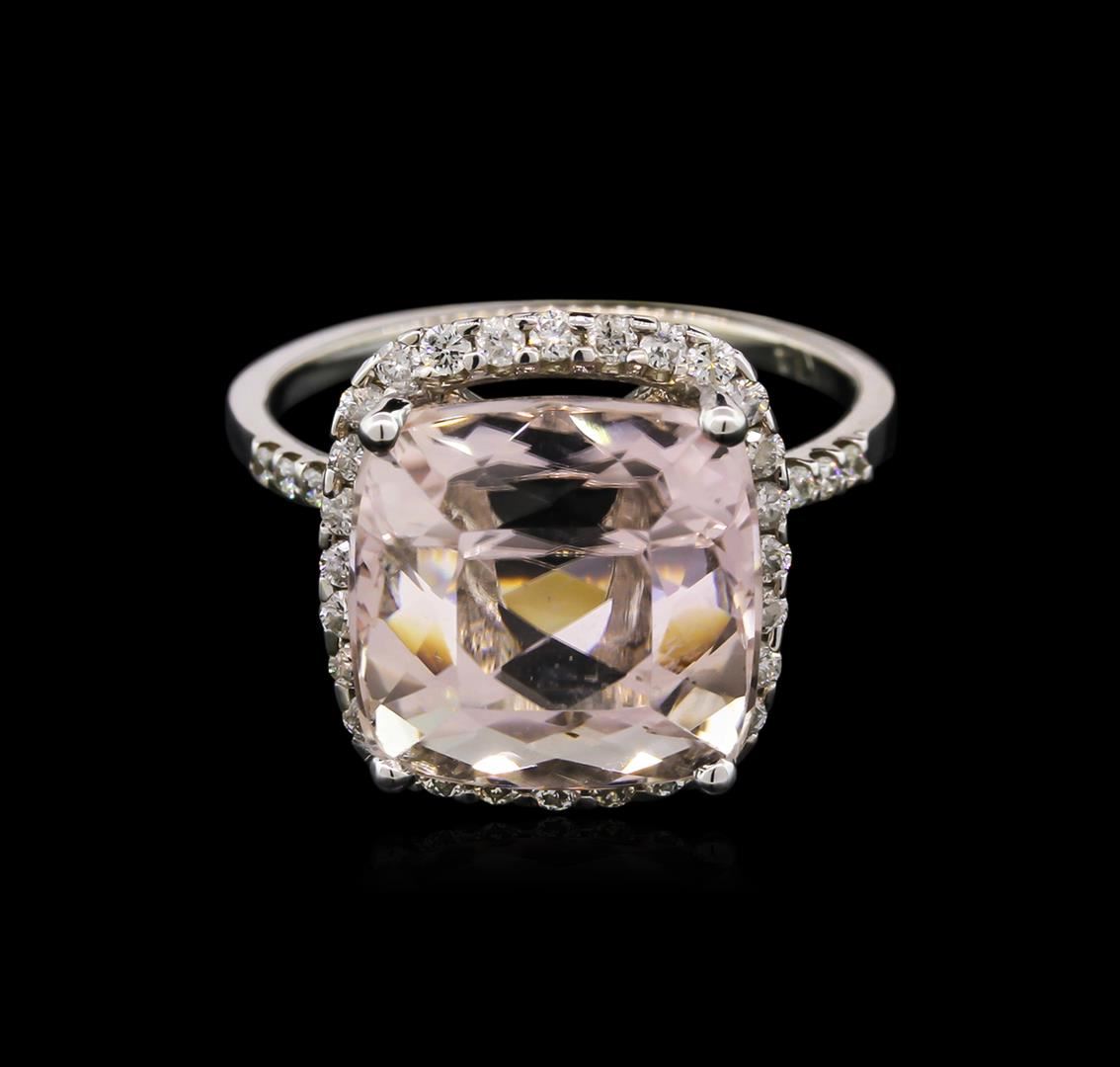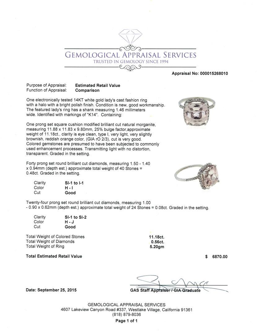 One electronically tested 14KT white gold lady's cast fashion ring with a halo with a bright polish finish. The featured lady's ring has a shank measuring 1.46 millimeters wide. Identified with markings of "K14". Condition is new, good workmanship. Containing: One prong set square cushion modified brilliant cut natural morganite, measuring 11.88 x 11.83 x 9.80mm, 25% bulge factor, approximate weight of 11.18ct., clarity is eye clean, type I, very light, very slightly brownish, reddish orange color, (GIA rO 2/3), cut is very good. Colored gemstones are presumed to have been subjected to commonly used enhancement processes. Transmitting light with no distortion, transparent. Graded in the setting. Forty prong set round brilliant cut diamonds, measuring 1.50 - 1.40 x 0.94mm (depth est.) approximate total weight of 40 Stones = 0.48ct. Graded in the setting. Clarity: SI-1 to I-1. Color: H - I. Cut Good Twenty-Four prong set round brilliant cut diamonds, measuring 1.00 - 0.90 x 0.62mm (depth est.) approximate total weight of 24 Stones = 0.08ct. Graded in the setting. Clarity: SI-1 to SI-2. Color: H - Good. Total Weight of Colored Stones 11.18ct. Total Weight of Diamonds 0.56ct. Total Weight of Ring 5.20gm at $6870.00.. GAS Appraised at $6,870.00.