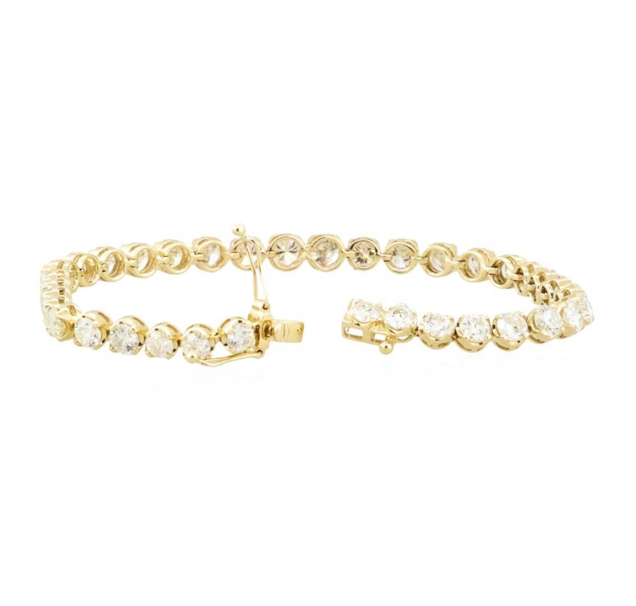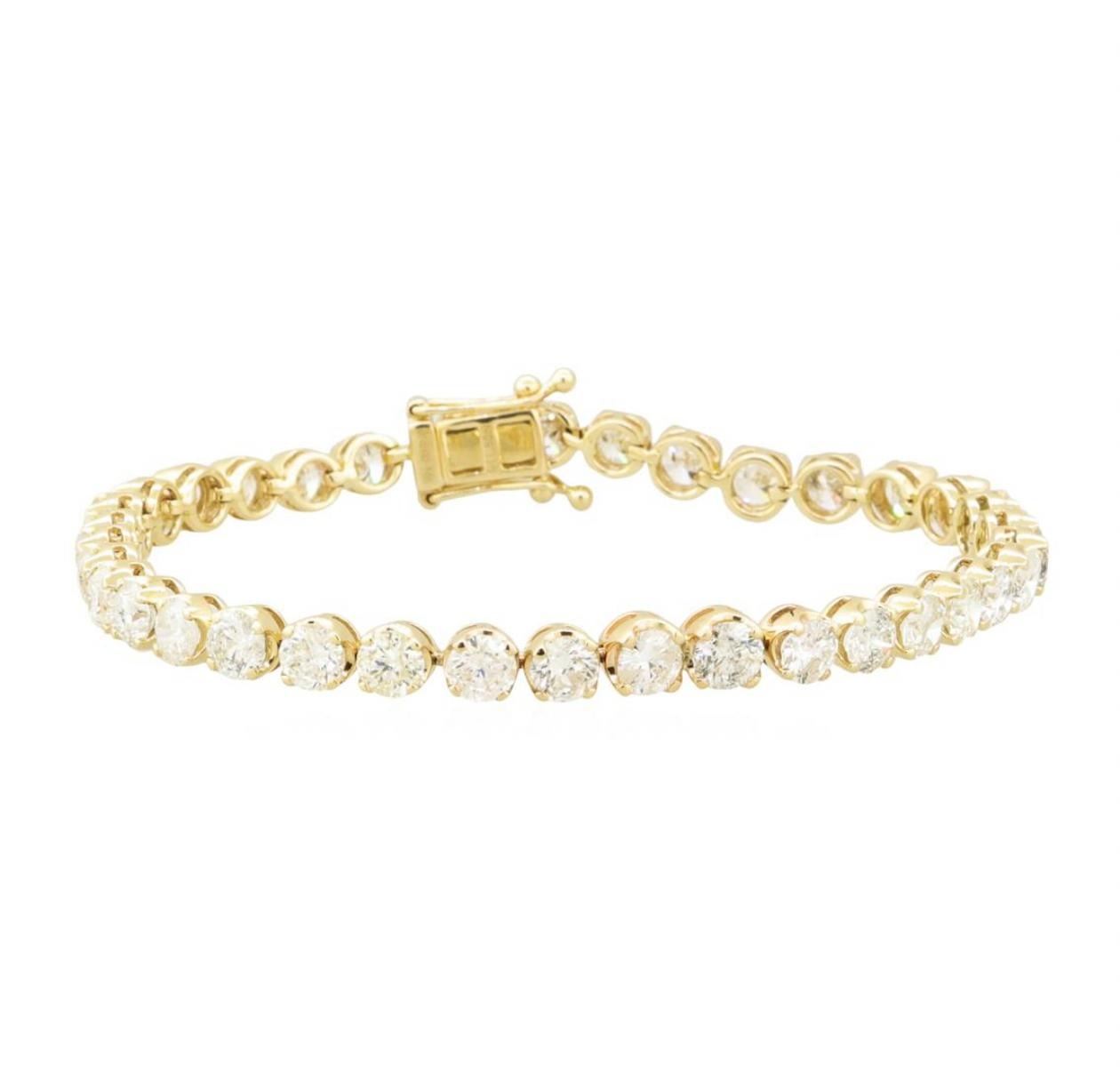 One electronically tested 14KT yellow gold cast & assembled diamond tennis bracelet. Seven and one-quarter inch length bracelet, completed by a hidden box clasp with twin safeties. bright polish finish. Trademark is Orianne. Identified with markings of "14K". Condition is new, good workmanship. Containing: Thirty-Six prong set round brilliant cut diamonds, measuring 4.50 - 4.00 x 2.76mm (depth est.) approximate total weight of 36 Stones = 11.19ct. Graded in the setting.Tennis bracelets & necklaces got their unusual name from an incident involving the U.S. professional tennis player Chris Evert during a tennis match in the 1980's. Evert had been wearing an expensive diamond bracelet, an inline string of individually-set diamonds. Previously these bracelets were known as eternity bracelets. When the clasp snapped during play, she asked the officials to stop the tennis match until the bracelet could be found. Since that day, bracelets and necklaces featuring an inline string of diamonds have been called tennis bracelets and tennis necklaces. Clarity I-1 to I-2 Color G - I Total Weight of Diamonds 11.19 ct. Total Weight of Tennis Bracelet 12.90 gm Estimated Retail Value $ 42,900.00 US