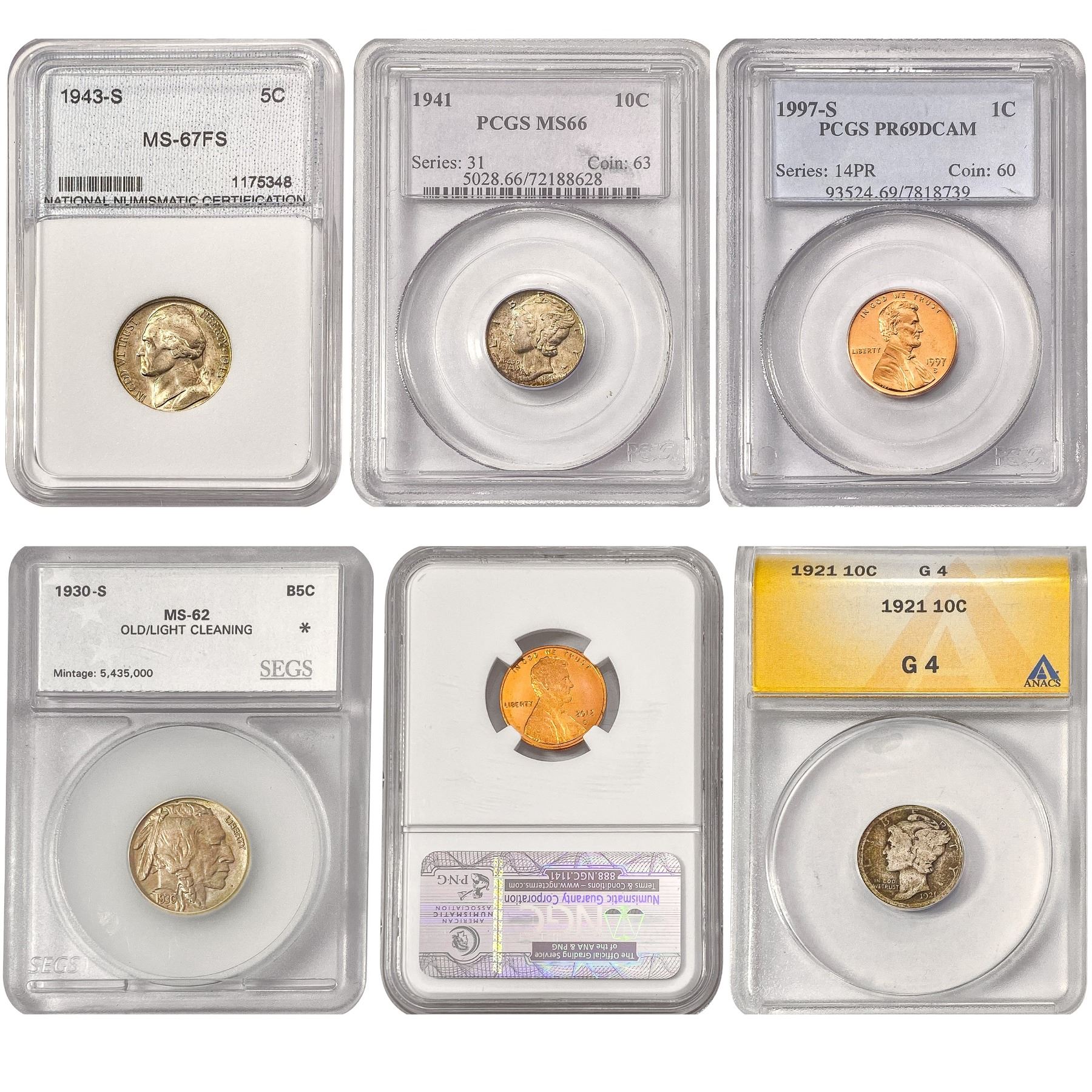 COINS AND CURRENCY LISTED IN GSA’S CATALOG AS GRADED AND ENCAPSULATED BY PCGS, NGC, ANACS, ICG, PCGS CURRENCY, PMG, PCGS BANKNOTE GRADING, CMC OR ANY OTHER THIRD-PARTY GRADING SERVICE ARE LIKEWISE SOLD “AS-IS” EXCEPT AS EXPRESSLY SET FORTH HEREIN. ALL THIRD-PARTY GRADING SERVICE GUARANTEES, INCLUDING AUTHENTICITY, ARE THE SOLE RESPONSIBILITY OF THE THIRD-PARTY GRADING SERVICE AND NOT WARRANTIES OR GUARANTEES OF GSA. BIDDERS SHOULD CONTACT THESE THIRD-PARTY GRADING SERVICES DIRECTLY WITH RESPECT TO ANY CLAIMS OR QUESTIONS THEY MAY HAVE CONCERNING THEIR GUARANTEES AND WARRANTIES. BIDDERS ACKNOWLEDGE AND AGREE THAT AUCTIONEER IS NOT BOUND BY OR LIABLE FOR ANY OPINION OR CERTIFICATION BY ANY THIRD-PARTY GRADING SERVICE. REMOVAL OF A PRODUCT FROM ITS PROTECTIVE CASING OR HOLDER OR ALTERATION OF ANY COIN HOLDER WAIVES ALL RIGHTS CONCERNING THE PRODUCT CONTAINED THEREIN.