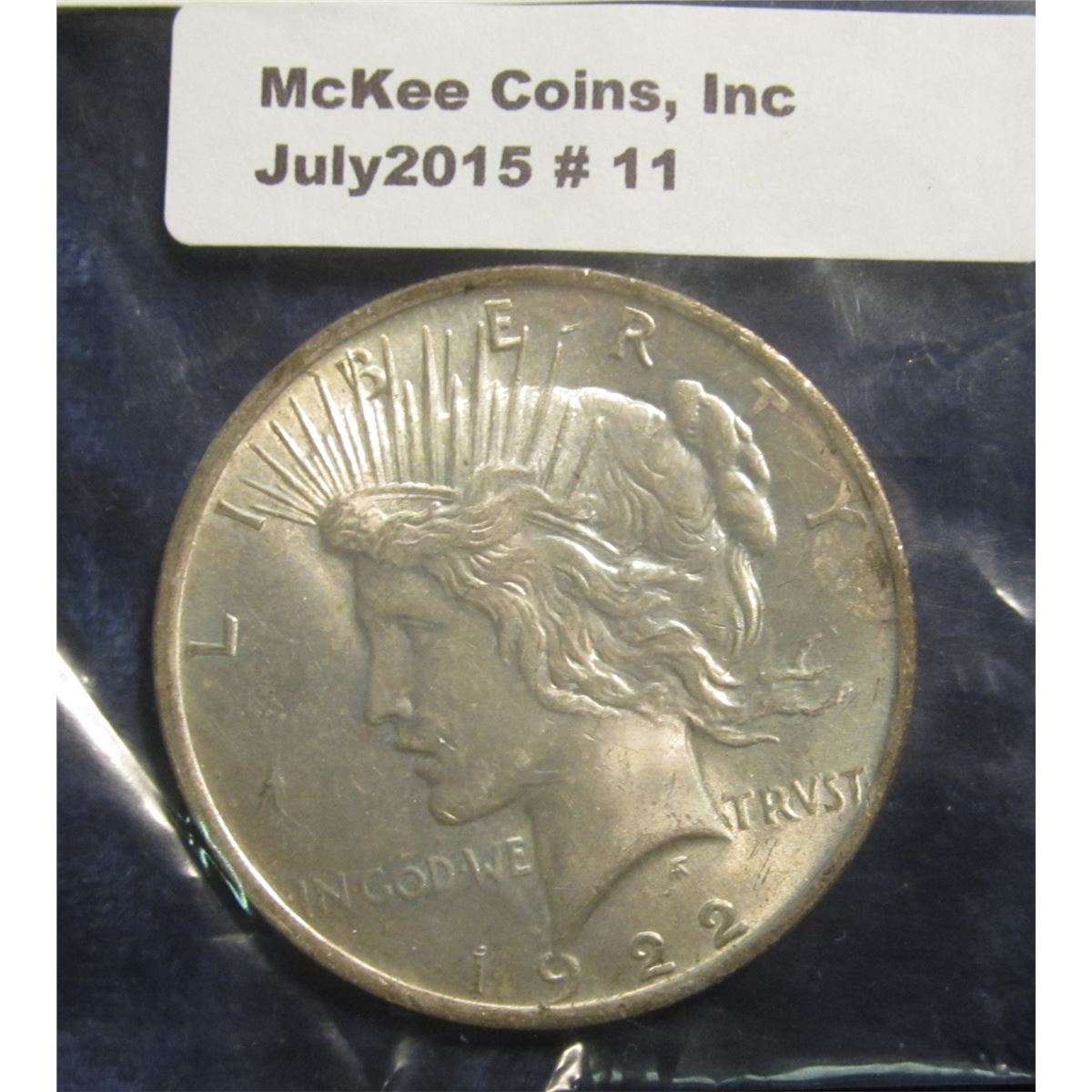 11. 1922 P Peace Silver Dollar. Lightly toned Original Unc.