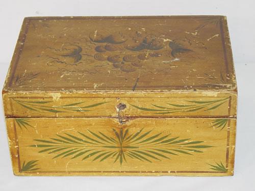 11" 19TH CENT. PAINT DECORATED PINE DOCUMENT BOX IN MUSTARD PAINT W/ PAINTED GRAPES, VINES & LEAFY DECORATION - PAINT LOSS, EDGE WEAR, IMPERFECTIONS
