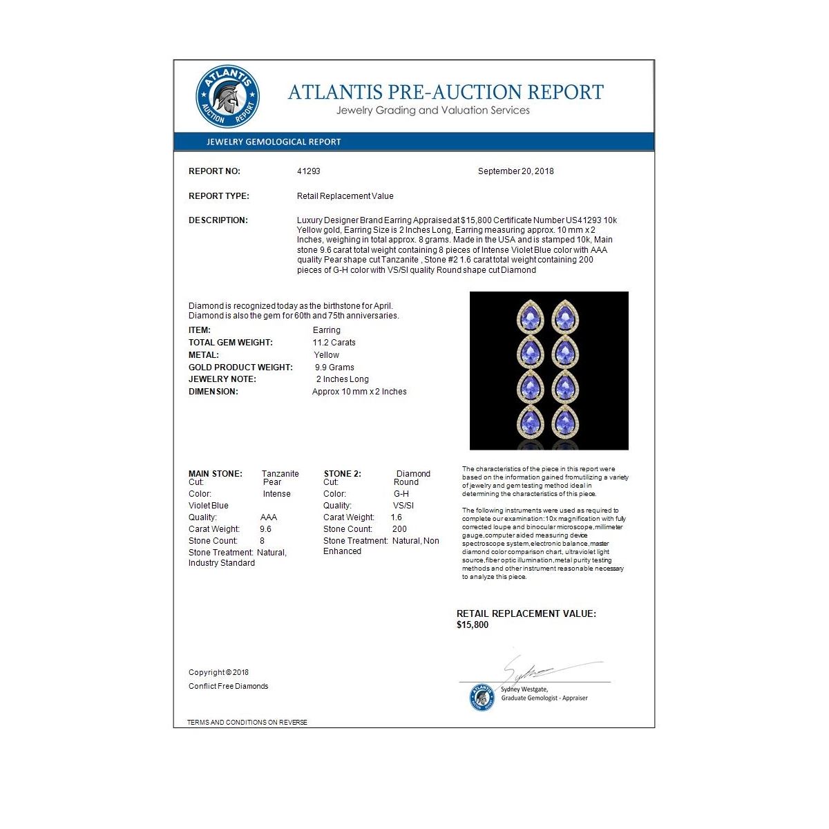 REF-286W9F -41293 ---- 11.2 CTW Tanzanite & Diamond Halo Earrings 10K Yellow Gold ---- Luxury Designer Brand Earring Appraised at $15,800 Certificate Number US41293 10k Yellow gold, Earring Size is 2 Inches Long, Earring measuring approx. 10 mm x 2 Inches, weighing in total approx. 8 grams. Made in the USA and is stamped 10k, Main stone 9.6 carat total weight containing 8 pieces of Intense Violet Blue color with AAA quality Pear shape cut Tanzanite , Stone #2 1.6 carat total weight containing 200 pieces of G-H color with VS/SI quality Round shape cut Diamond