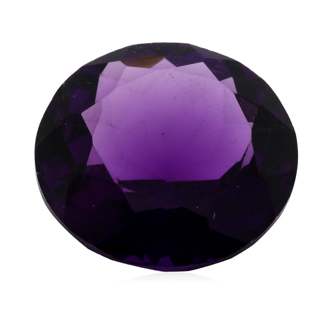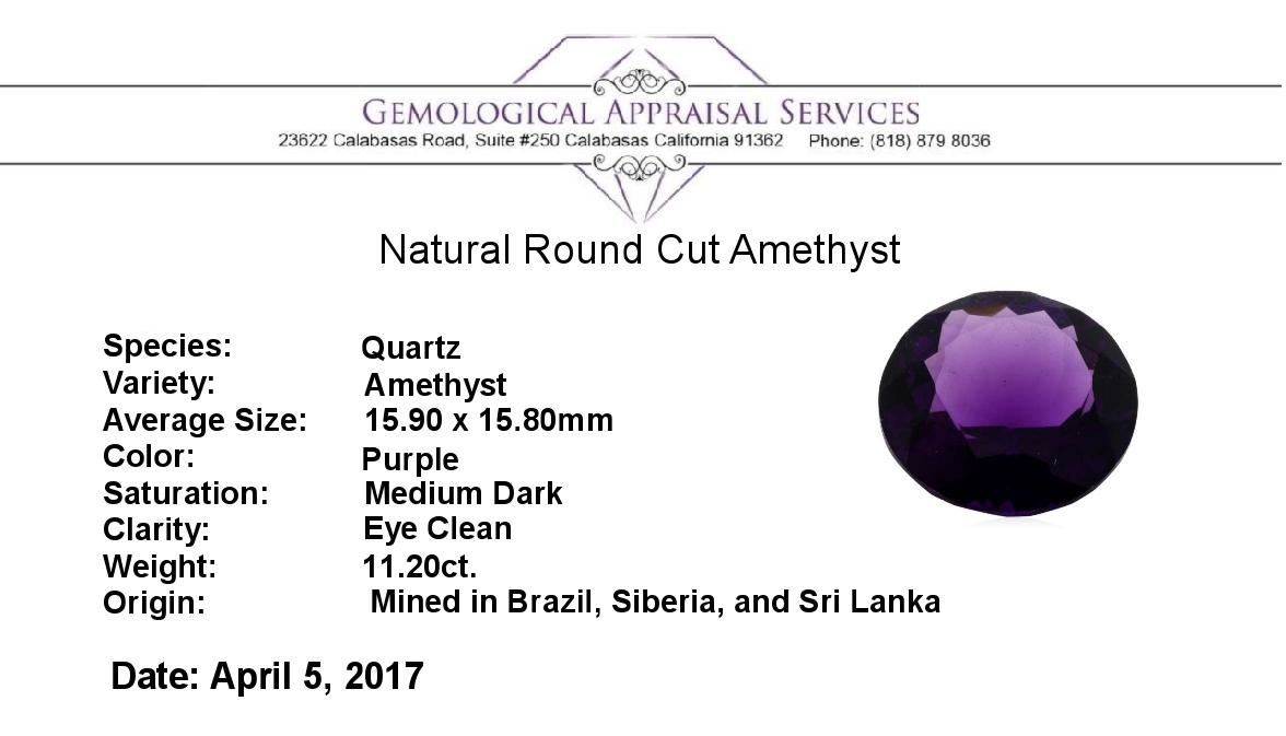One natural round cut amethyst with an exact weight of 11.20ct., clarity is eye clean, purple, medium dark. Gemological Appraisals Services estimates the retail value at $336 GAS Appraised.