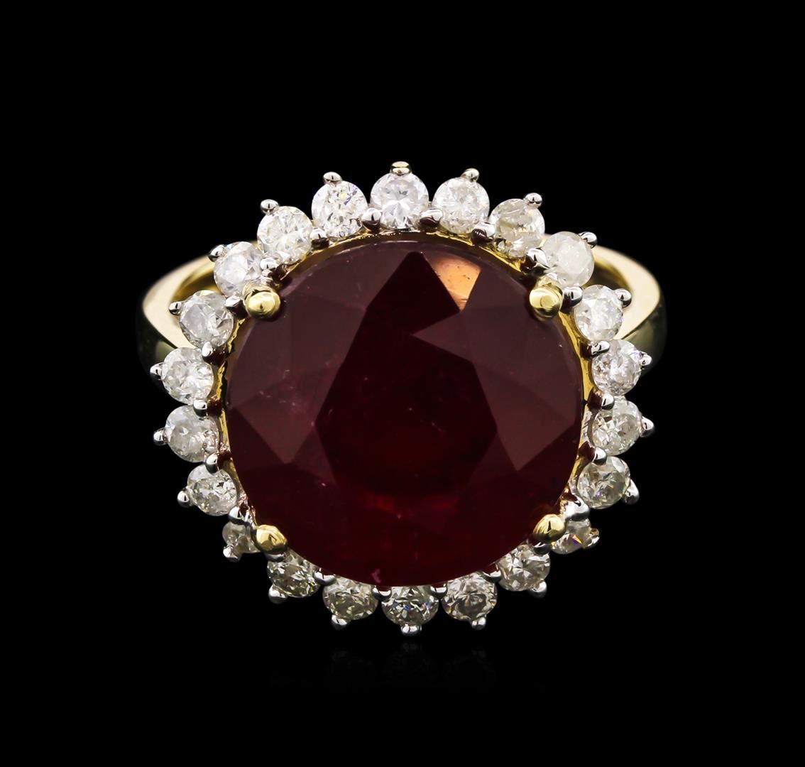 One electronically tested yellow gold ladies cast ruby and diamond ring. Condition is new, good workmanship. The featured ruby is set within a diamond bezel, completed by a three and one-half millimeter wide band. Bright polish finish with rhodium accents. Trademark is Orianne. Identified with markings of "14K". Containing: One prong set round mixed cut natural ruby, measuring 13.00 - 12.90 x 6.85 mm, 20% bulge factor, approximate weight of 11.2let., clarity is heavily included, type II, dark, very slightly brownish, slightly purplish red color,(GIA slpR 7/3), cut is good. Transmitting light somewhat diffusely, transparent to translucent. Naturally occurring internal & external characteristics are present. Indications of laboratory high temperature heat treatment, with glass & flux additives. Graded in the setting. Ruby has a low tolerance to rhodium plating, repolishing the surface, & ultrasonic cleaning. Twenty-two prong set round brilliant cut diamonds, measuring 2.30 - 2.20 x 1.35mm (depth est.) approximate total weight of 22 Stones = 0.93ct. Graded in the setting. Clarity: I-1 to I-2.Color: G - I. AIG Appraised at $4,685.00.