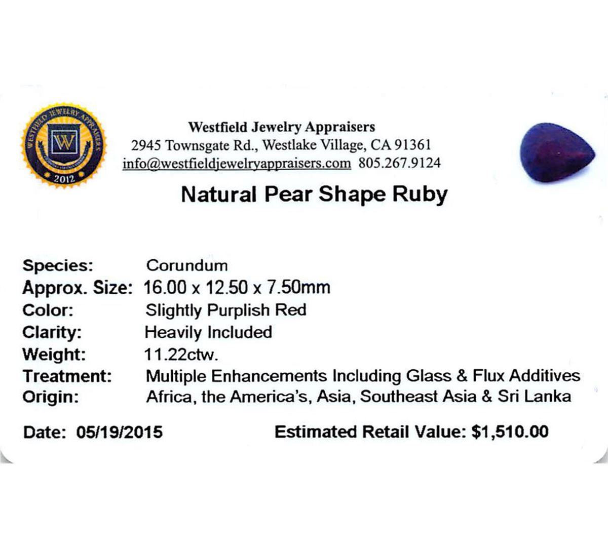 One pear mixed cut natural ruby, measuring 16.00 x 12.50 x 7.50mm, exact weight 11.22ct., clarity is heavily included, type II, dark, very slightly brownish, slightly purplish red color, (GIA slpR 7/3), cut is good. Transmitting light somewhat diffusely, transparent to translucent. Naturally occurring internal & external characteristics are present. Indications of laboratory high temperature heat treatment, with glass & flux additives. Ruby has a low tolerance to rhodium plating, repolishing the surface, & ultrasonic cleaning. Westfield Appraised at $1,510.00.