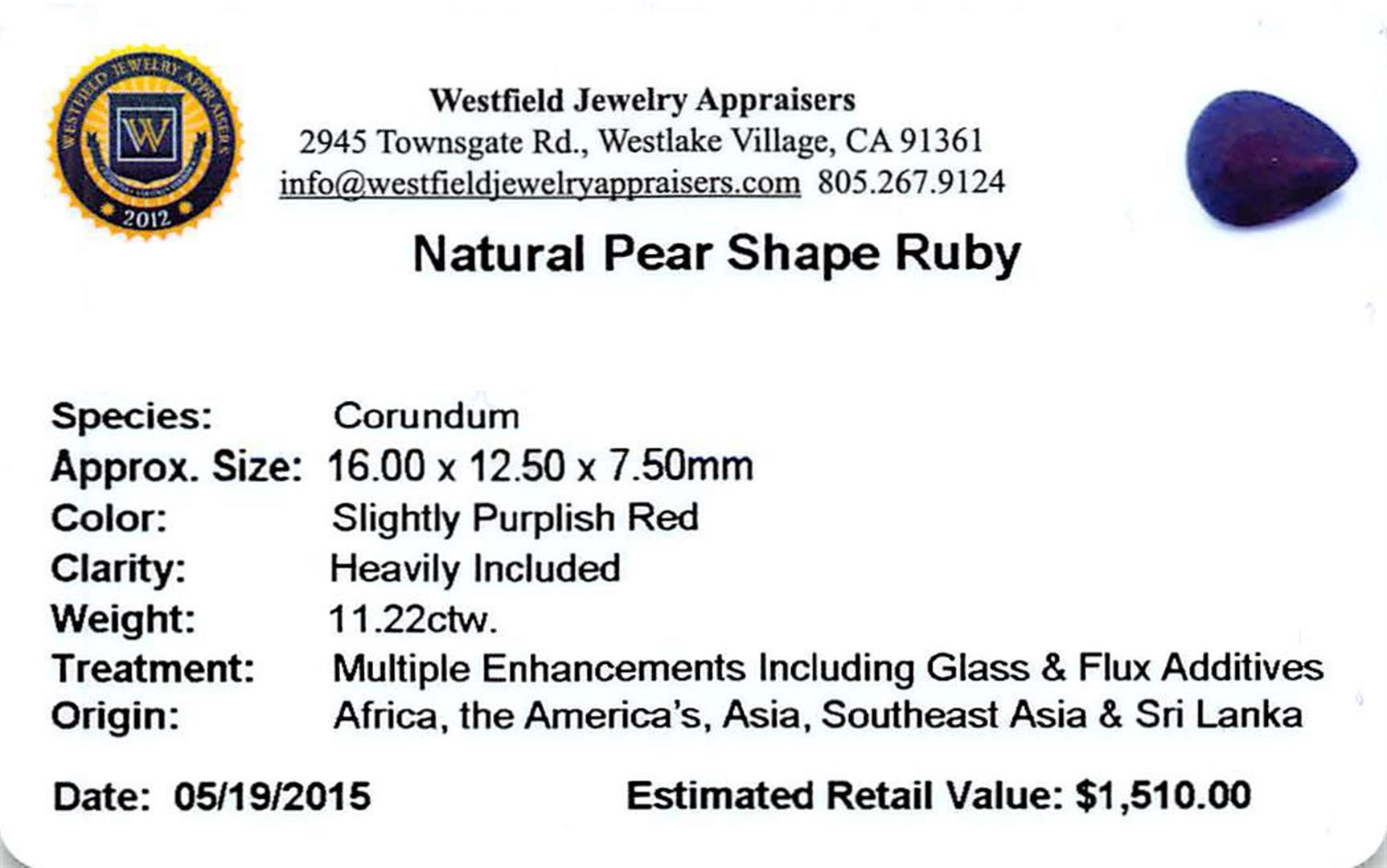 One pear mixed cut natural ruby, measuring 16.00 x 12.50 x 7.50mm, exact weight 11.22ct., clarity is heavily included, type II, dark, very slightly brownish, slightly purplish red color, (GIA slpR 7/3), cut is good. Transmitting light somewhat diffusely, transparent to translucent. Naturally occurring internal & external characteristics are present. Indications of laboratory high temperature heat treatment, with glass & flux additives. Ruby has a low tolerance to rhodium plating, repolishing the surface, & ultrasonic cleaning. Westfield Appraised at $1,510.00.
