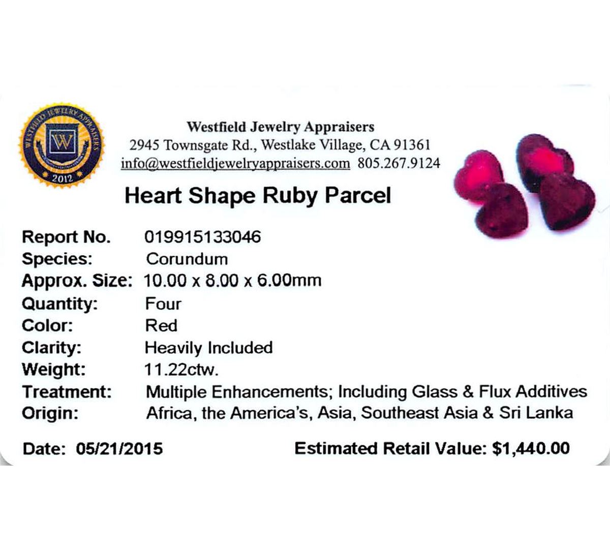 Four heart mixed cut natural rubies, measuring 10.00 x 8.00 x 6.00mm, exact total weight 11.22ct., clarity is heavily included, type II, dark, very slightly brownish, red color, (GIA R 7/3), cut is good. Measurements are an average for the group. Transmitting light somewhat diffusely, transparent to translucent. Naturally occurring internal & external characteristics are present. Indications of laboratory high temperature heat treatment, with glass & flux additives. Ruby has a low tolerance to rhodium plating, repolishing the surface, & ultrasonic cleaning. Westfield Appraised at $1,440.00.