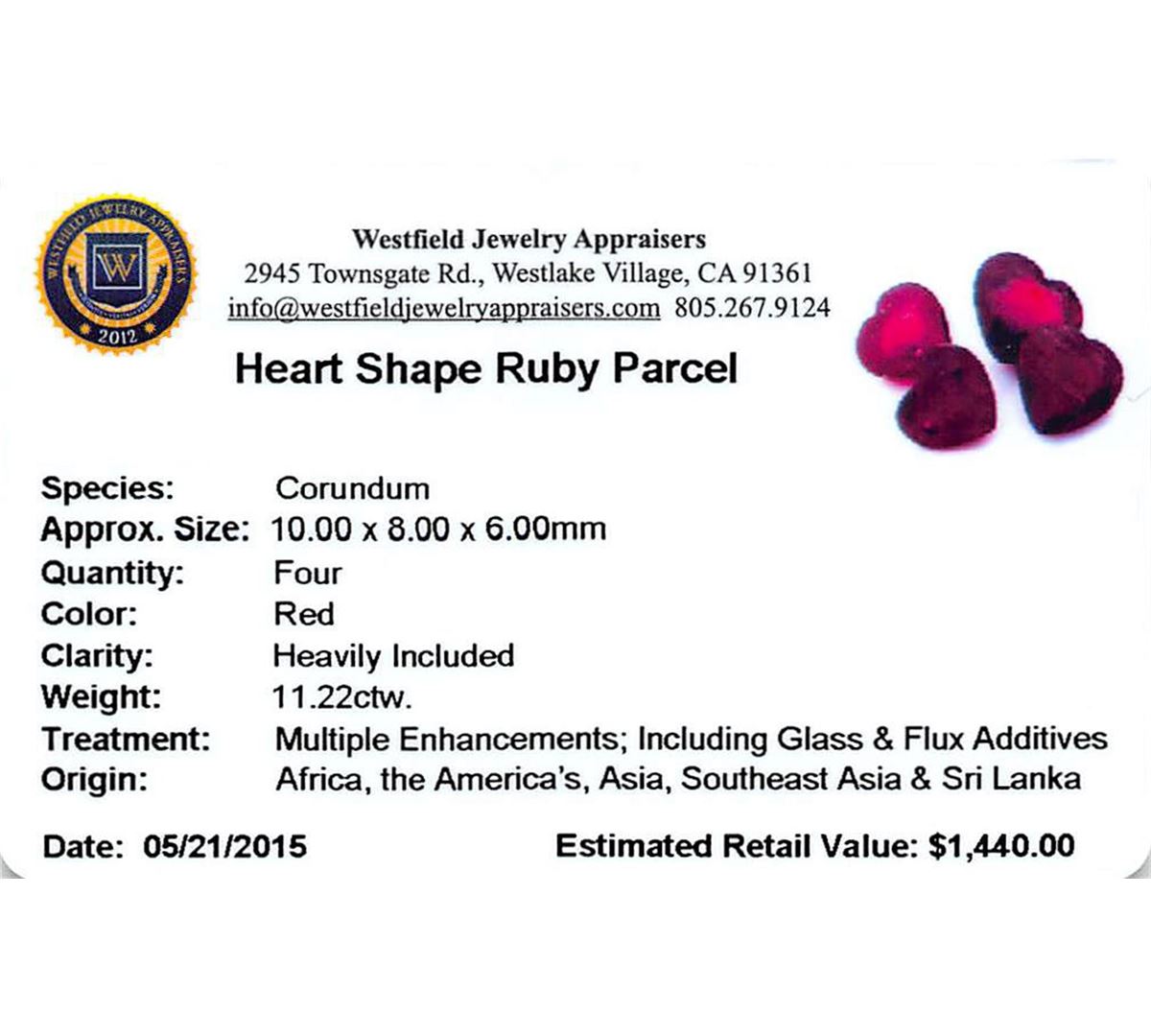 Four heart mixed cut natural rubies, measuring 10.00 x 8.00 x 6.00mm, exact total weight 11.22ct., clarity is heavily included, type II, dark, very slightly brownish, red color, (GIA R 7/3), cut is good. Measurements are an average for the group. Transmitting light somewhat diffusely, transparent to translucent. Naturally occurring internal & external characteristics are present. Indications of laboratory high temperature heat treatment, with glass & flux additives. Ruby has a low tolerance to rhodium plating, repolishing the surface, & ultrasonic cleaning. UGS Appraised at $1,440.00.