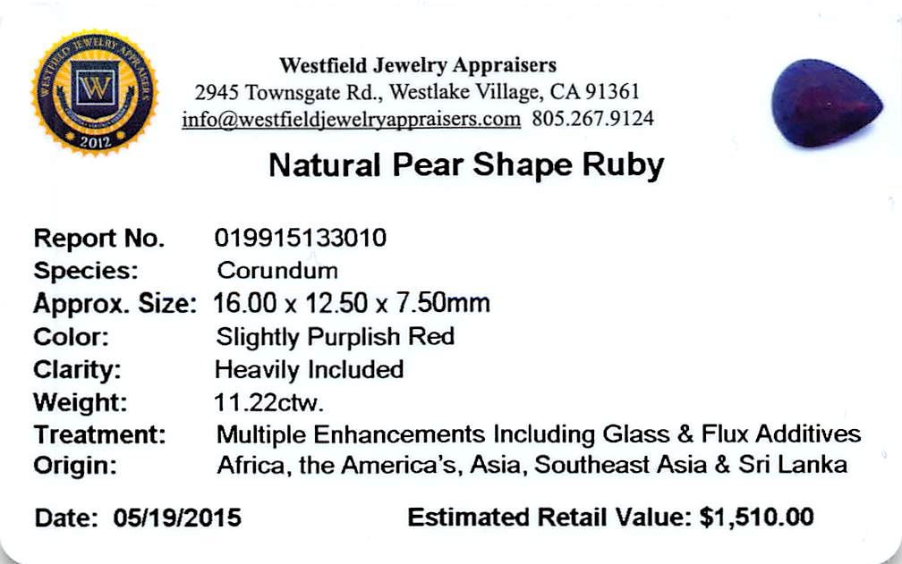 One pear mixed cut natural ruby, measuring 16.00 x 12.50 x 7.50mm, exact weight 11.22ct., clarity is heavily included, type II, dark, very slightly brownish, slightly purplish red color, (GIA slpR 7/3), cut is good. Transmitting light somewhat diffusely, transparent to translucent. Naturally occurring internal & external characteristics are present. Indications of laboratory high temperature heat treatment, with glass & flux additives. Ruby has a low tolerance to rhodium plating, repolishing the surface, & ultrasonic cleaning. Westfield Appraised at $1,510.00.