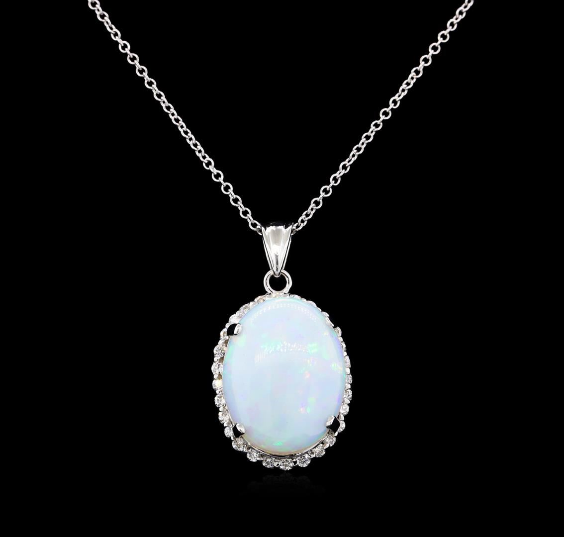 One electronically tested 14KT white gold lady's combination cast & assembled halo pendant & chain 18.0" long, 1.5mm round cable link with a lobster claw clasp with a bright polish finish. Identified with markings of "14K". Condition is new, good workmanship. Containing: One semi crystal opal that is cut in a oval shaped cabochon and is prong set, measuring 20.68 mm long x 16.11 mm wide, and 7.05 mm thick and the approximate weight is 11.23 carats. The opal has a somewhat bright, blue-green play of color (fire) in a broad flashfire pattern; a medium dome; a good cut; ; consistent in its brightness and pattern; and is very directional. Graded in the setting. Twenty-Eight prong set round brilliant cut diamonds, measuring 1.90 - 1.85 x 1.17mm (depth est.) approximate total weight of 28 Stones = 0.73ct. Graded in the setting. Clarity: VS-2 to SI-1. Color: H - I. Cut Good. Total Weight of Diamonds 0.73ct. Total Weight of Opals 11.23ct. Total Weight of Pendant & Chain 8.30gm. GAS Appraised at $9,325.00.