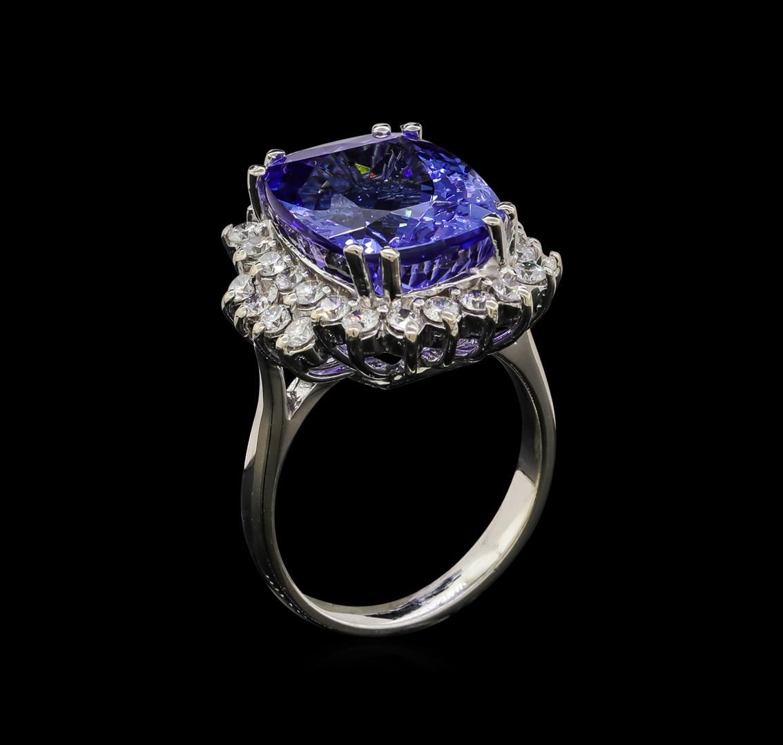 One electronically tested 14KT white gold lady's cast fashion ring with a double basket halo with a bright polish finish. The featured lady's ring has a shank measuring 2.66 millimeters wide. Identified with markings of 'K14'. Condition is new, good workmanship. Containing: One prong set rectangular cushion modified brilliant cut natural tanzanite, measuring 13.87 x 11.46 x 8.61mm, (depth est.) 4%. bulge factor, approximate weight of 11.23ct., clarity is eye clean, medium dark, moderately strong, violetish blue color, (GIA vB 6/4), cut is very good. Transmitting light with no distortion, transparent. Colored gemstones are presumed to have been subjected to commonly used enhancement processes. Graded in the setting. Thirty prong set round brilliant cut diamonds, measuring 2.10 - 2.05 x 1.29mm (depth est.) approximate total weight of 30 Stones = 1.01ct. Graded in the setting. Clarity VS-2 to SI-2. Color: H - I Cut Good. Total Weight of Colored Stones 11.23ct.. Total Weight of Diamonds 1.01ct.. Total Weight of Ring 8.80gm GAS Appraised at $23,805.00.