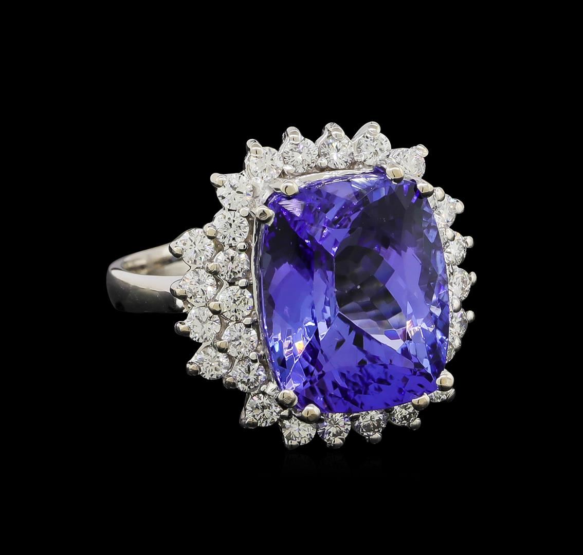 One electronically tested 14KT white gold lady's cast fashion ring with a double basket halo with a bright polish finish. The featured lady's ring has a shank measuring 2.66 millimeters wide. Identified with markings of 'K14'. Condition is new, good workmanship. Containing: One prong set rectangular cushion modified brilliant cut natural tanzanite, measuring 13.87 x 11.46 x 8.61mm, (depth est.) 4%. bulge factor, approximate weight of 11.23ct., clarity is eye clean, medium dark, moderately strong, violetish blue color, (GIA vB 6/4), cut is very good. Transmitting light with no distortion, transparent. Colored gemstones are presumed to have been subjected to commonly used enhancement processes. Graded in the setting. Thirty prong set round brilliant cut diamonds, measuring 2.10 - 2.05 x 1.29mm (depth est.) approximate total weight of 30 Stones = 1.01ct. Graded in the setting. Clarity VS-2 to SI-2. Color: H - I Cut Good. Total Weight of Colored Stones 11.23ct.. Total Weight of Diamonds 1.01ct.. Total Weight of Ring 8.80gm GAS Appraised at $23,805.00.