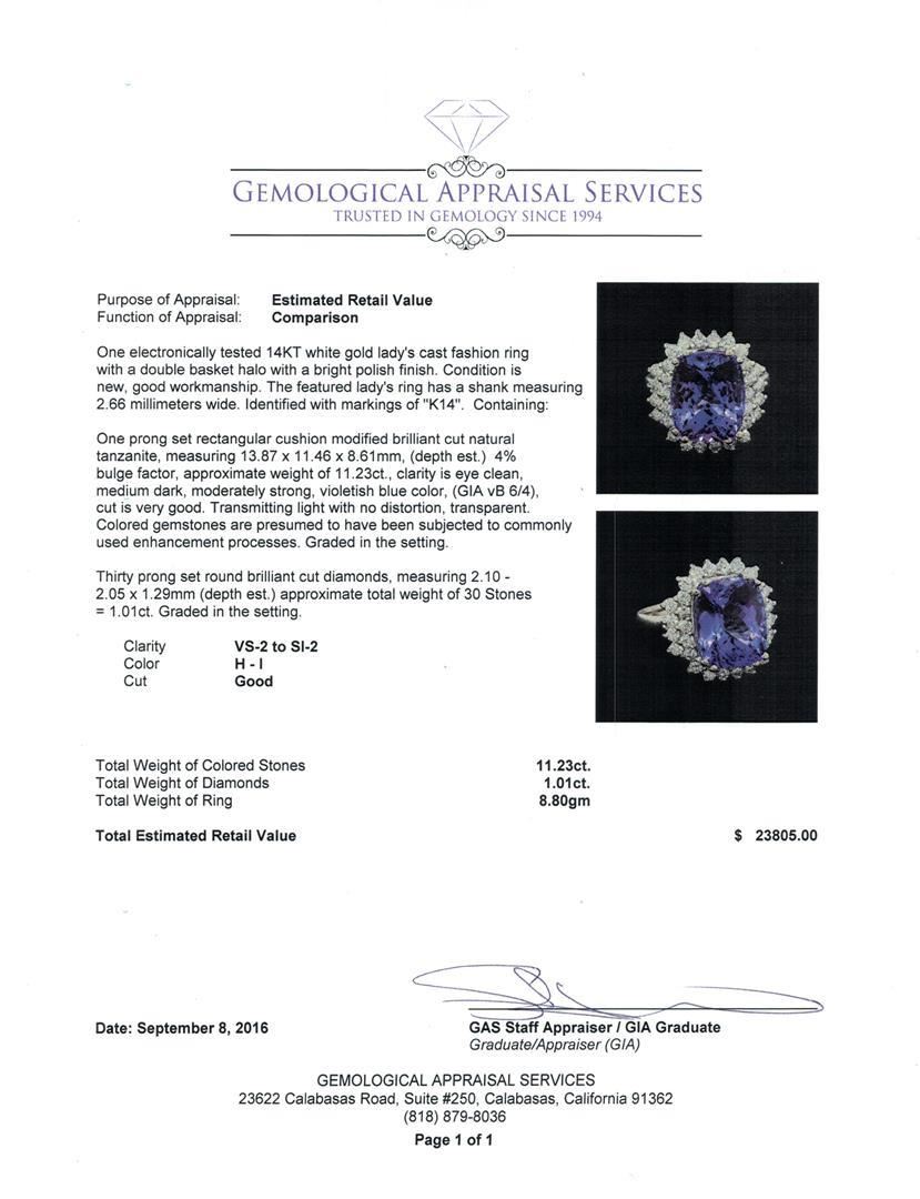 One electronically tested 14KT white gold lady's cast fashion ring with a double basket halo with a bright polish finish. The featured lady's ring has a shank measuring 2.66 millimeters wide. Identified with markings of 'K14'. Condition is new, good workmanship. Containing: One prong set rectangular cushion modified brilliant cut natural tanzanite, measuring 13.87 x 11.46 x 8.61mm, (depth est.) 4%. bulge factor, approximate weight of 11.23ct., clarity is eye clean, medium dark, moderately strong, violetish blue color, (GIA vB 6/4), cut is very good. Transmitting light with no distortion, transparent. Colored gemstones are presumed to have been subjected to commonly used enhancement processes. Graded in the setting. Thirty prong set round brilliant cut diamonds, measuring 2.10 - 2.05 x 1.29mm (depth est.) approximate total weight of 30 Stones = 1.01ct. Graded in the setting. Clarity VS-2 to SI-2. Color: H - I Cut Good. Total Weight of Colored Stones 11.23ct.. Total Weight of Diamonds 1.01ct.. Total Weight of Ring 8.80gm GAS Appraised.